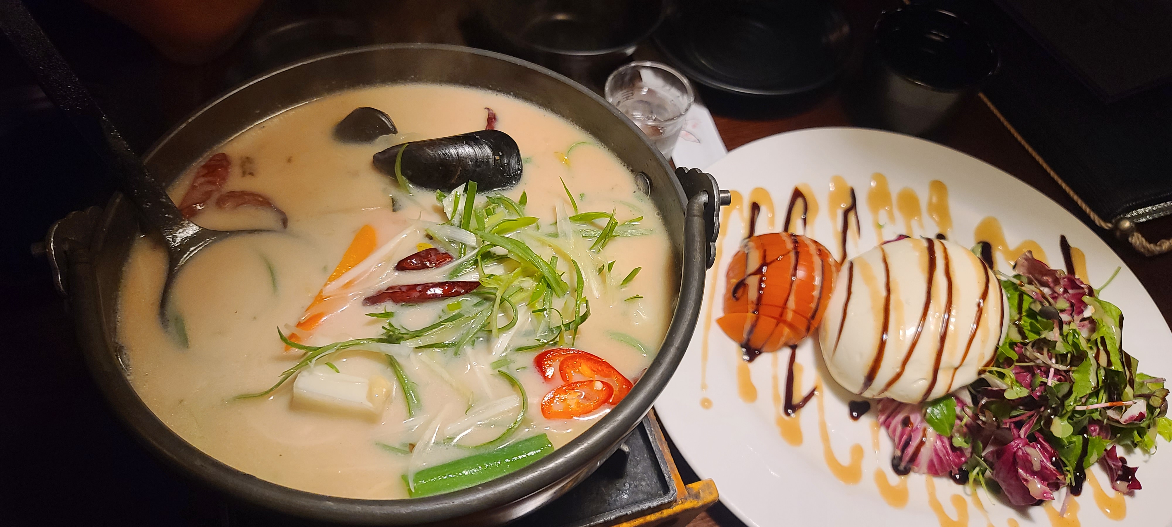 모찌리도후에 이어서 국물안주로 주문한 나가사키짬뽕탕도 나와서 우윳빛이 어울리는 무척 조화로운 비주얼을 보여주고 있습니다. 조용한 공간에서 국물요리와 샐러드 어두우면서도 낭만적인 분위기 그리고 빗소리 모든것이 좋은 술자리의 여건을 여김없이 보여주고 있습니다.