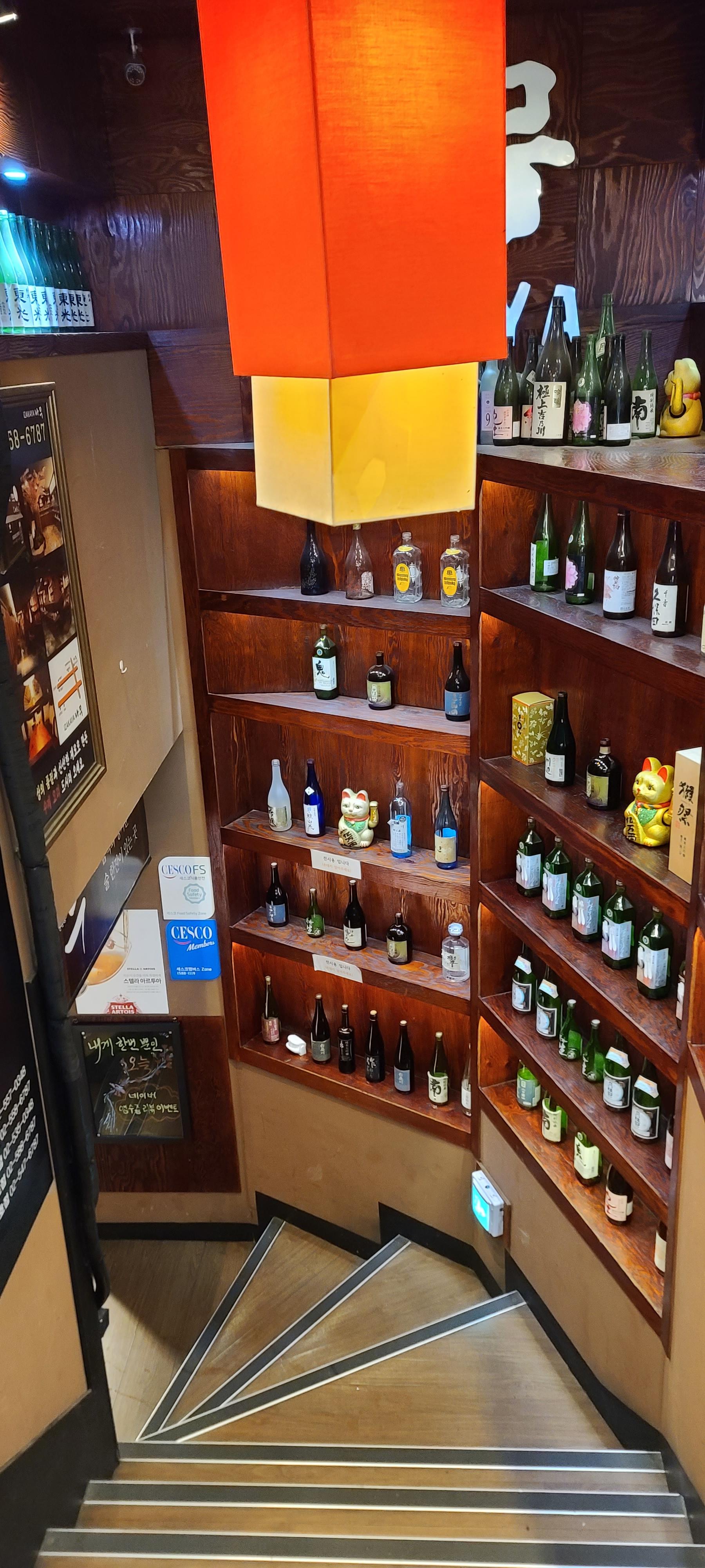 입구에 들어서니 가장 눈에 들어오는 것은 바로 나선형계단에 벽면을 가득 채우고 있는 다양한 사케들입니다. 가지런히 진열된 사케의 모습이 더욱 일본식 이자카야의 분위기를 자아내고 있으며 카운터앞에서 보니 벚꽃을 형상화한 사쿠라 장식도 가게 내부를 장식하고 있어서 더욱 술맛이 나는 분위기라는 것을 느끼게 됩니다.