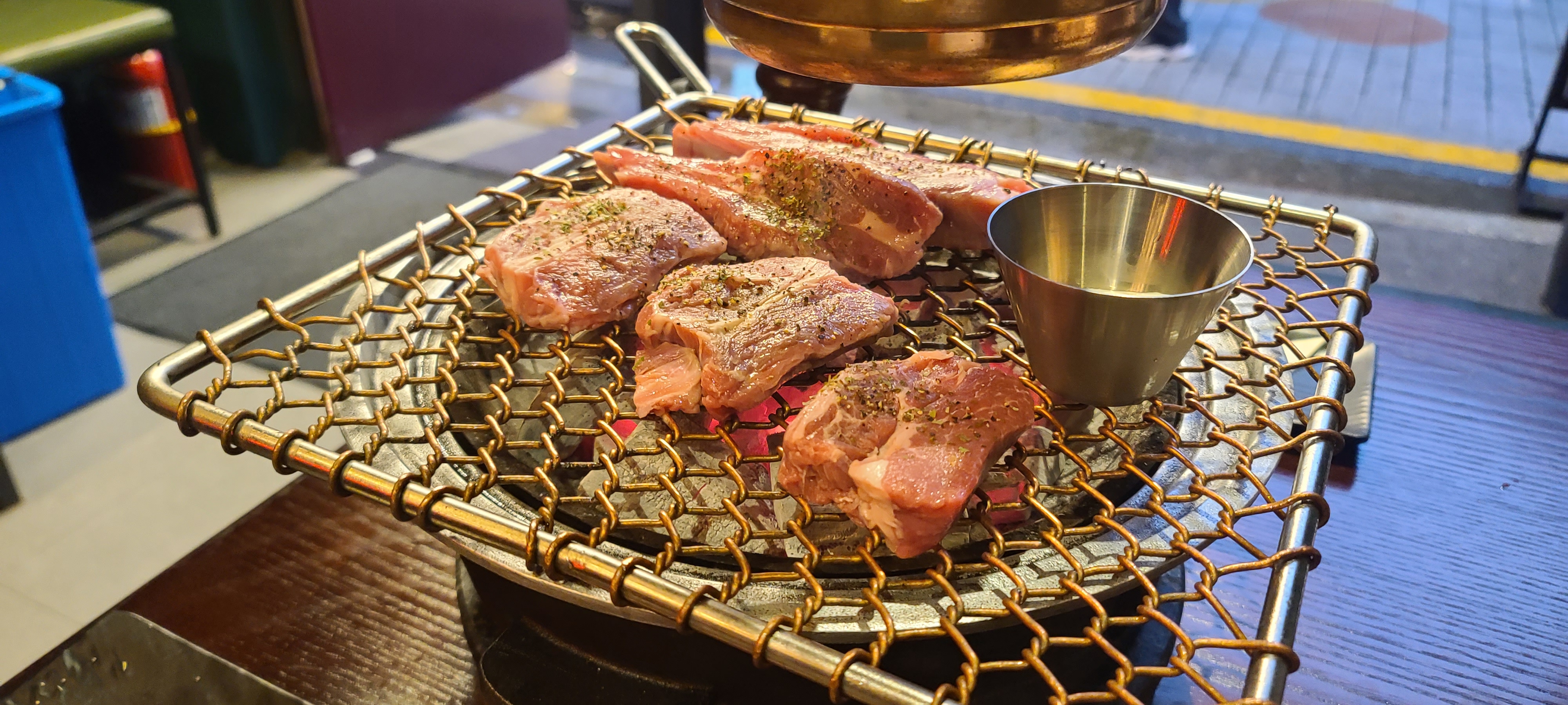 고기가 구워지는 동안 세팅된 양념을 살펴보니 3가지 색의 양념들과 쯔란이 세팅되어 있고 자리마다 돌판으로 만들어진 플레이트가 세팅되어 있어서 취향대로 양념을 조합해서 맛보도록 구성이 되어 있습니다. 각 양념을 여쭤보니 양꼬치 시즈닝과 소금 그리고 마늘양념의 구성이며 취향에 따라 덜어서 찍거나 혹은 섞어서 새로운 양념을 만들어낼 수가 있다는 점이 참으로 신기하게 다가옵니다.