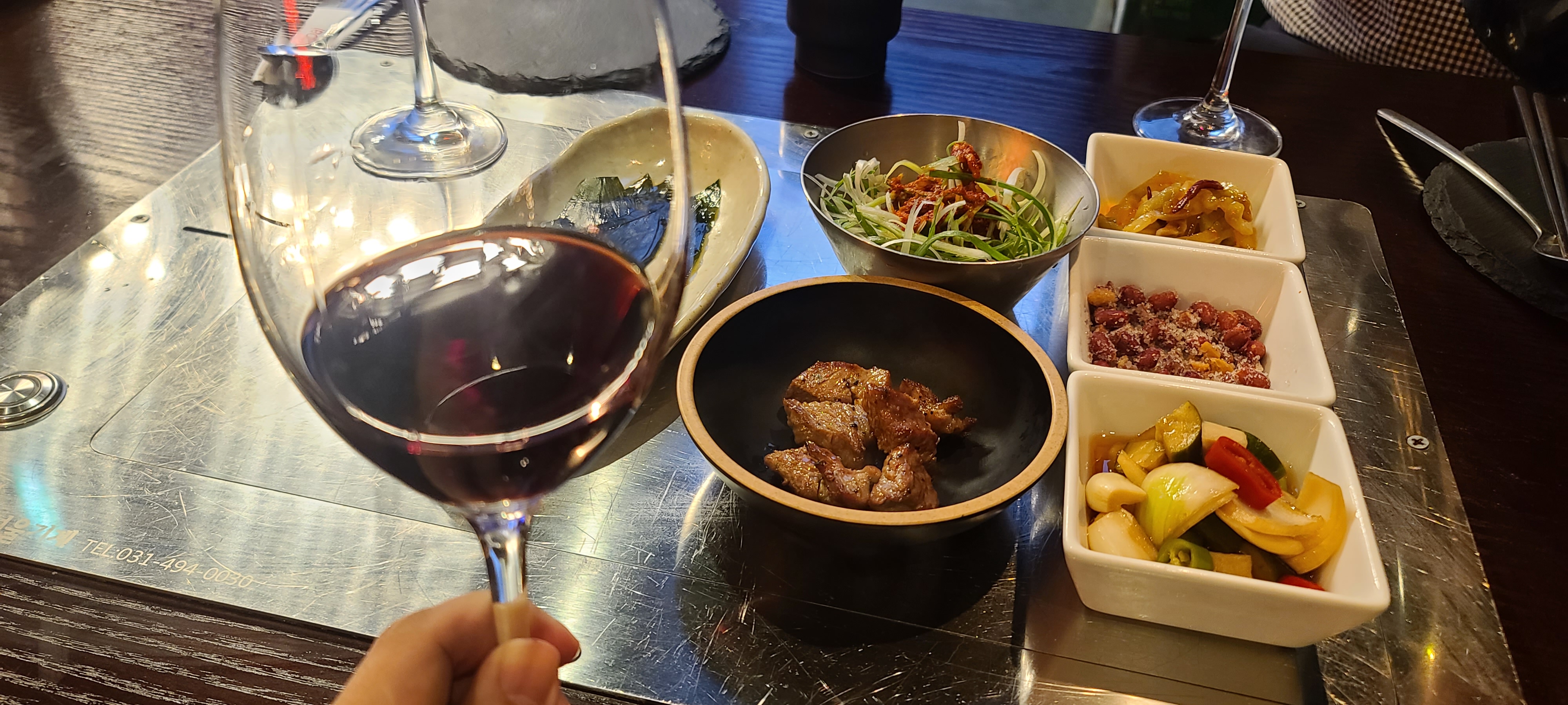 잠시 기다리자 양고기 세트가 나오고 준비해간 와인을 와인잔에 따라 분위기 있게 연출을 해봅니다. 양파이는 와인 콜키지가 가능하기 때문에 와인을 준비해갔으며 코르크차지는 병당 1만원을 받고 있습니다. 양고기의 담백하면서도 기름진 맛을 잘 받쳐주도록 까베르네소비뇽 품종으로 만든 와인을 준비해갔으며 고기가 구워지기도 전인데 벌써부터 기분이 좋아지는 것을 느끼게 됩니다.