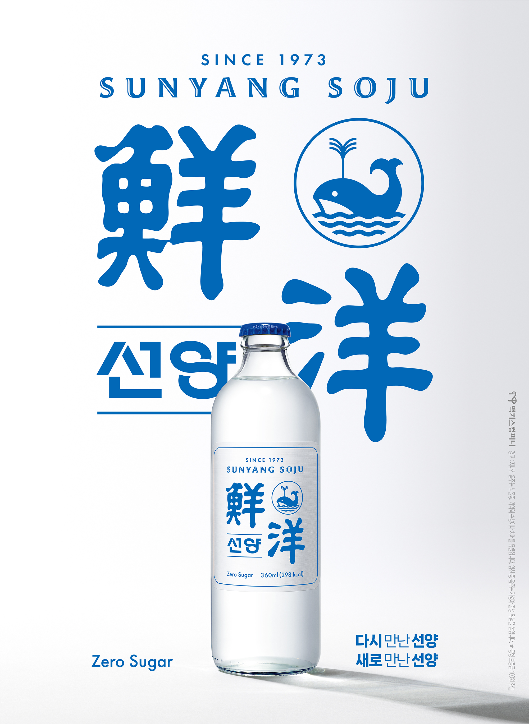 제품광고를 자세히 살펴보면 푸르고 하얀 배경에 바다의 상징 고래 아이콘을 사용하여 푸르른 대양의 이미지를 나타내고 있는 것을 알 수 있으며 14.9도의 도수에 당을 첨가하지 않은 저칼로리, 저도수 소주라는 것을 내세우고 있습니다.