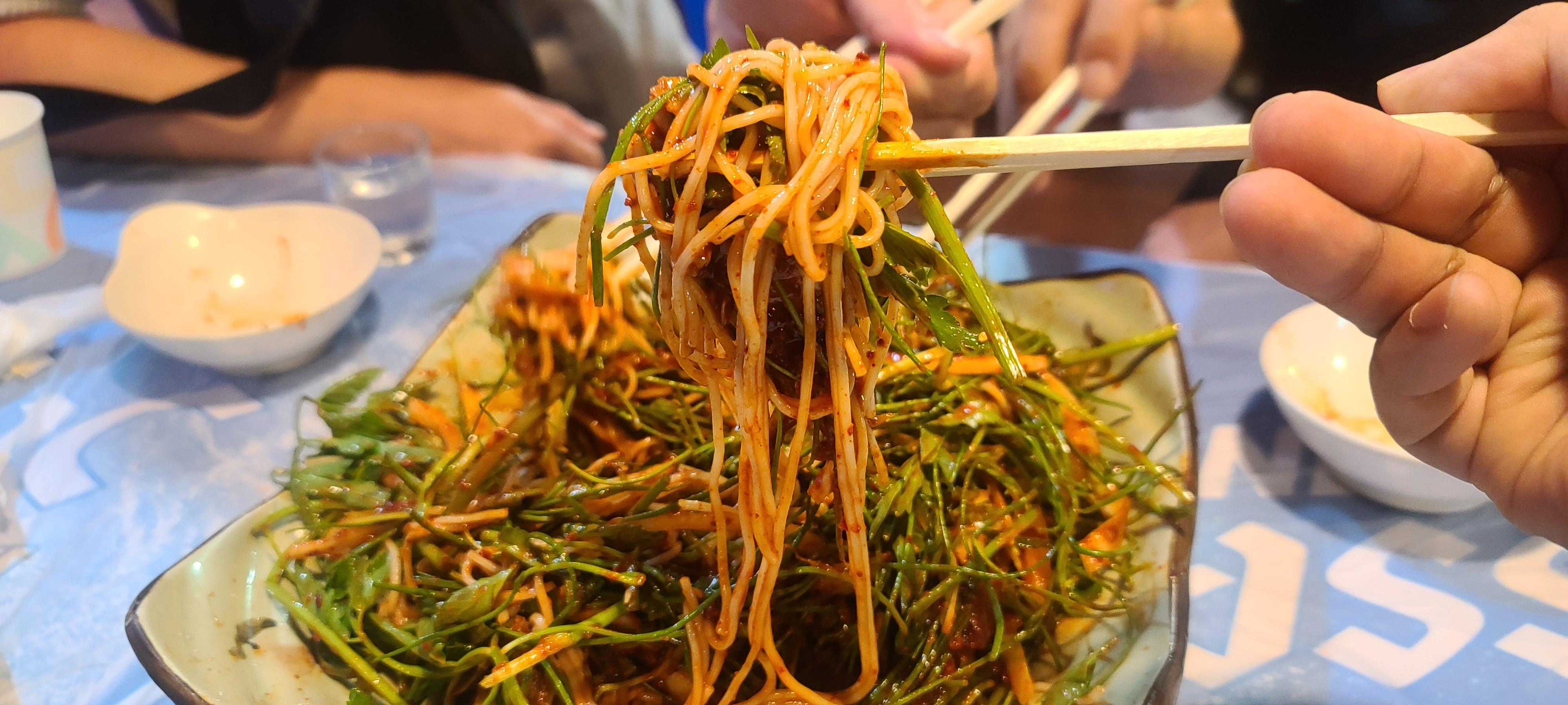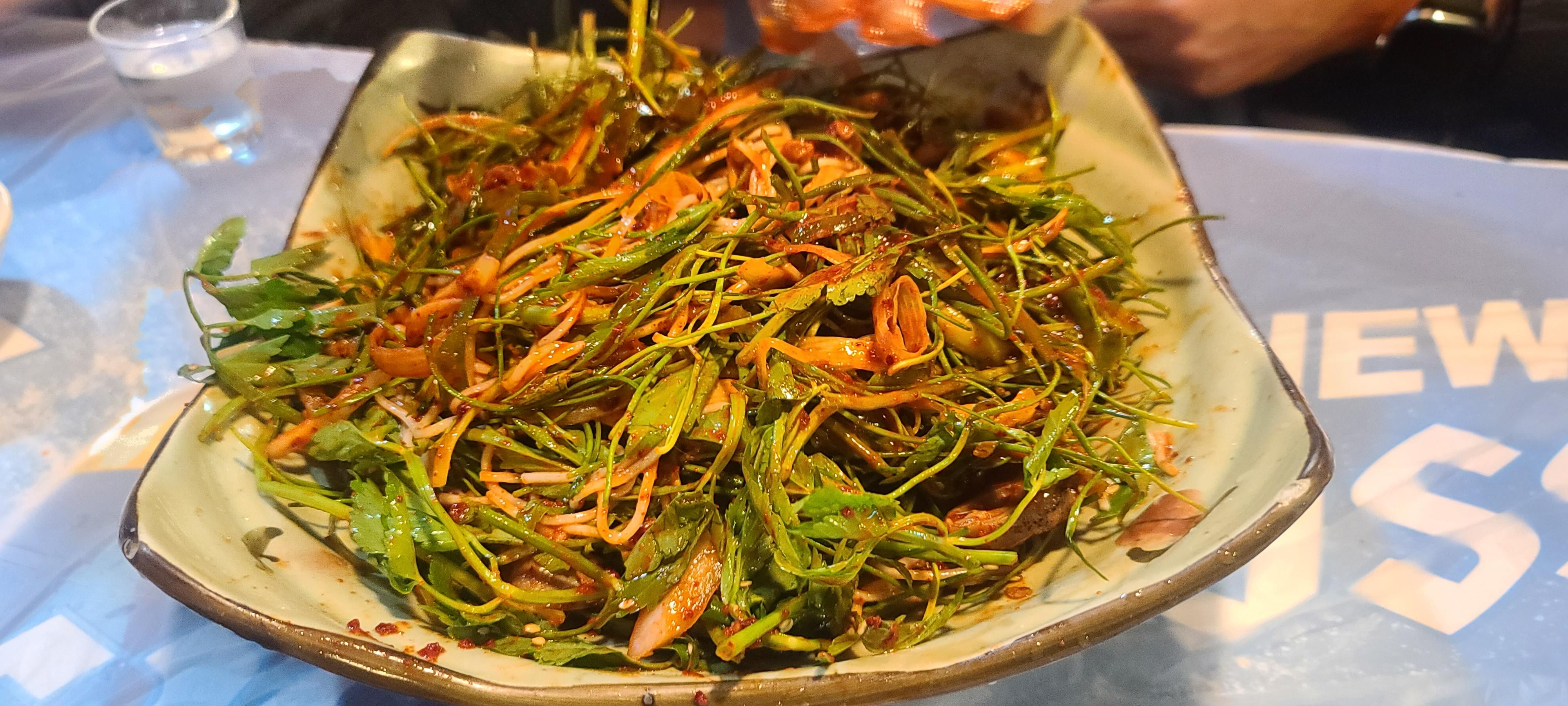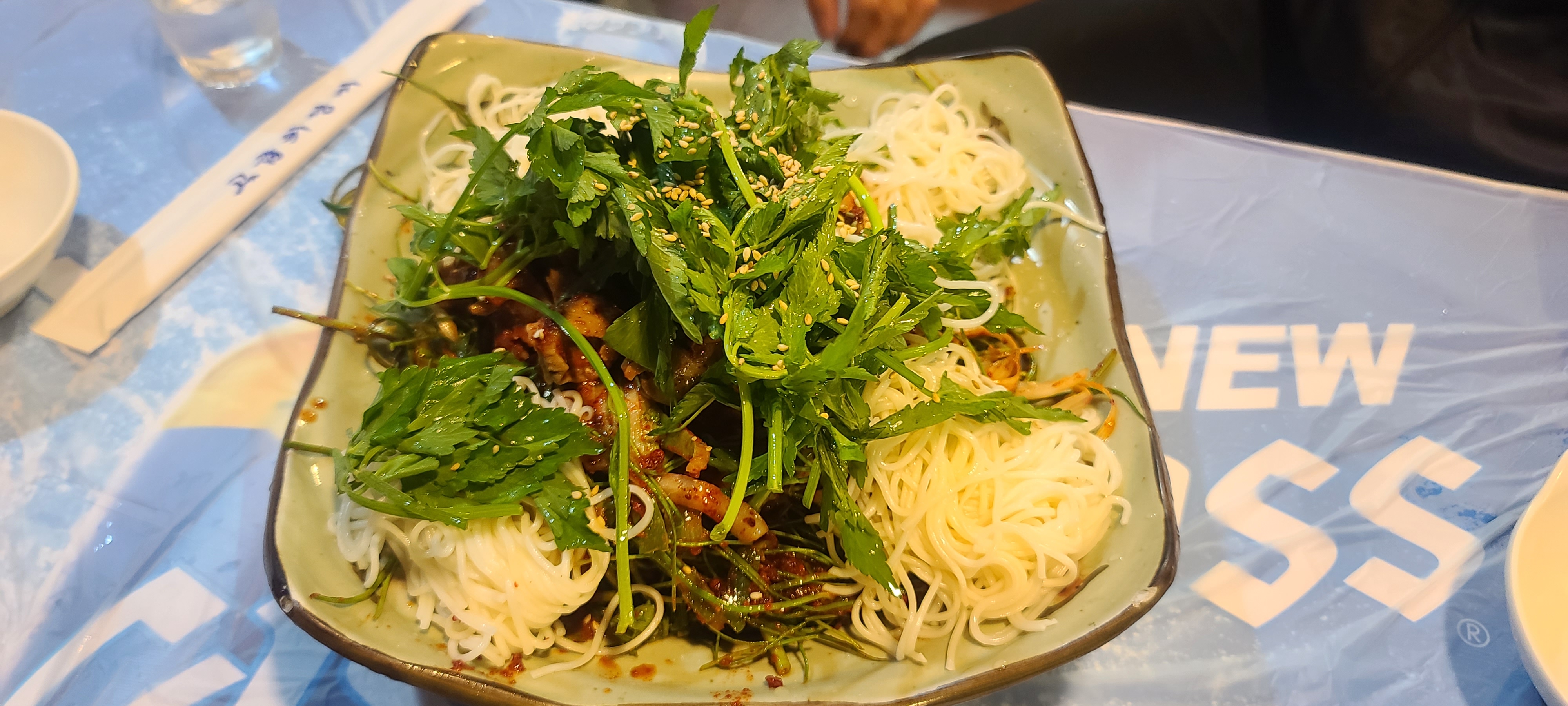 맛있게 비벼진 골뱅이 소면의 모습을 담아보니 새싹과 미나리 그리고 파채가 어우러져 엄청난 양을 보이는 골뱅이무침의 비주얼이 참으로 다른곳에서 보는 것과는 다르게 느껴집니다. 생맥주를 인당 2000cc는 먹어야 다 비울것만 같은 양에 감탄하며 과연 맛은 어떨까 하는 기대감을 가지고 시식을 시작합니다.