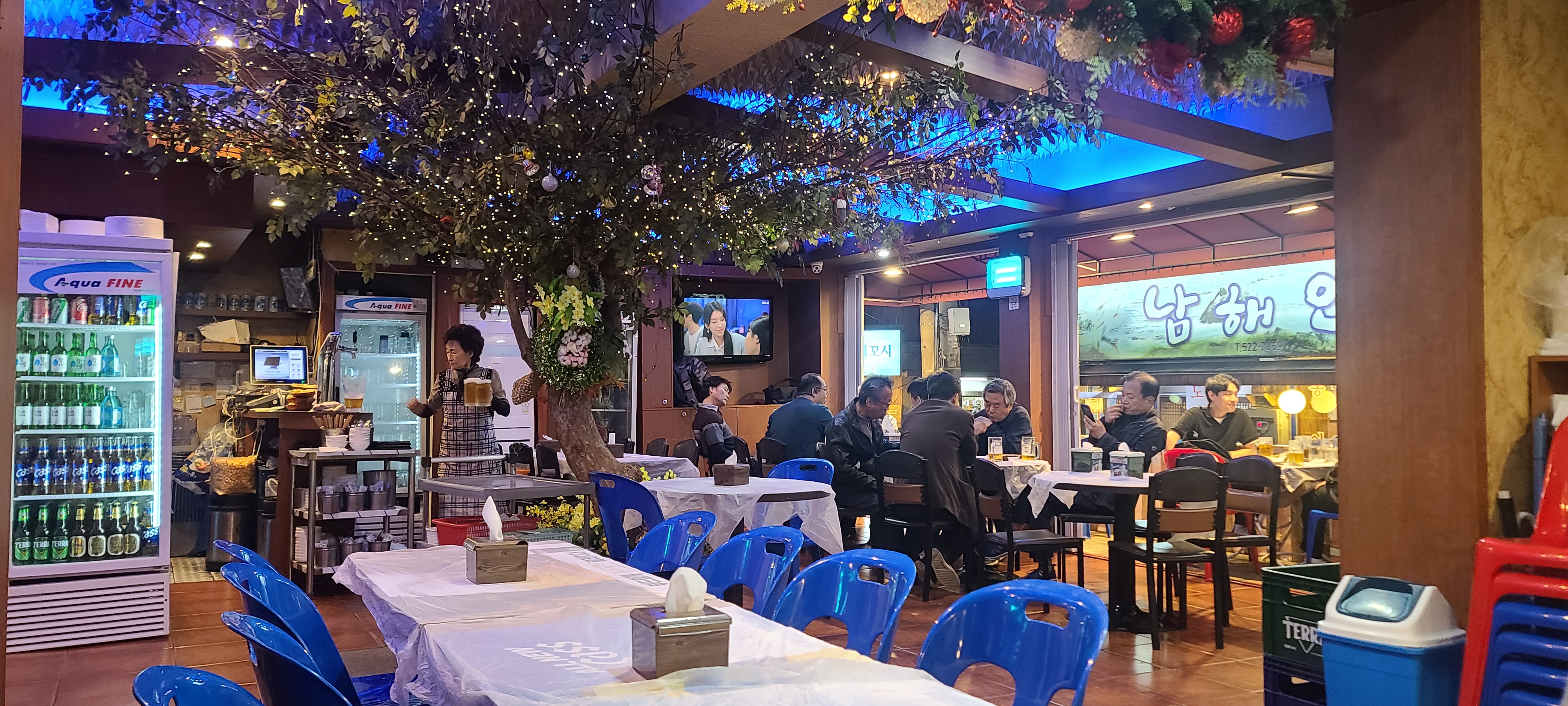 들어가서 자리를 잡고 가게 안을 둘러보니 포장마차 야장의 느낌이 나도록 플라스틱 테이블에 플라스틱의자 그리고 테이블은 비닐로 덮여있고 기둥에는 LED전구가 불을 뿜고 있는 나무장식이 가을철 야장의 느낌을 잘 전해주고 있습니다. 사장님으로 보이는 나이가 있으신 여성분께서는 쉴새없이 호프를 나르면서 제법 분주한 모습이 보였으며 전체적인 분위기는 40대 이상 나이대가 조금 있으신 분들이 자주 찾는 분위기의 가게 느낌을 내고 있습니다.
