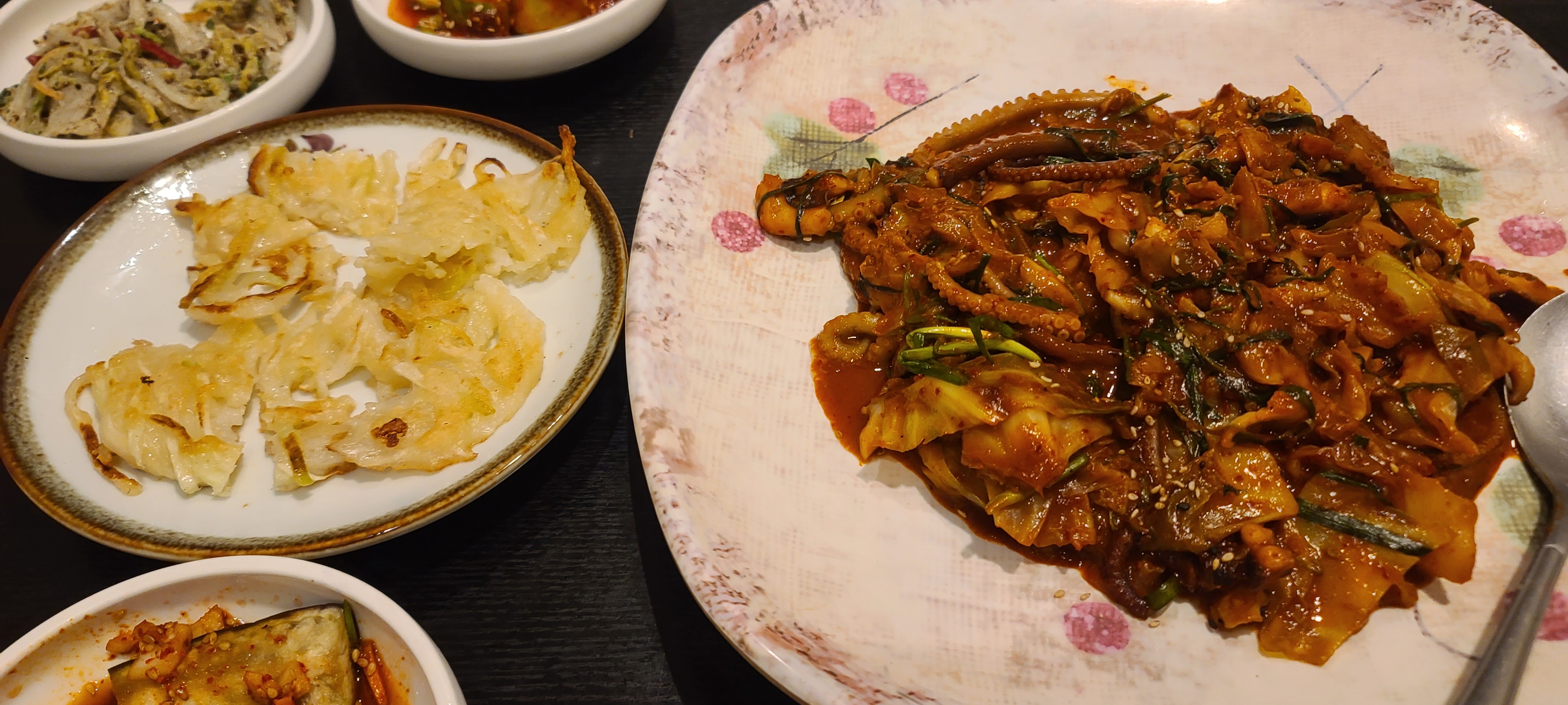 서비스로 주신 전과 함께 낙지볶음을 곁들여서 먹으니 바삭바삭한 식감과 함께 담백한 전의 맛이 매콤한 낙지볶음과 만나서 천상의 하모니를 연출하고 있습니다. 감탄스러운 맛에 감동하며 즐거운 비즈니스 대화는 계속되고 있습니다.