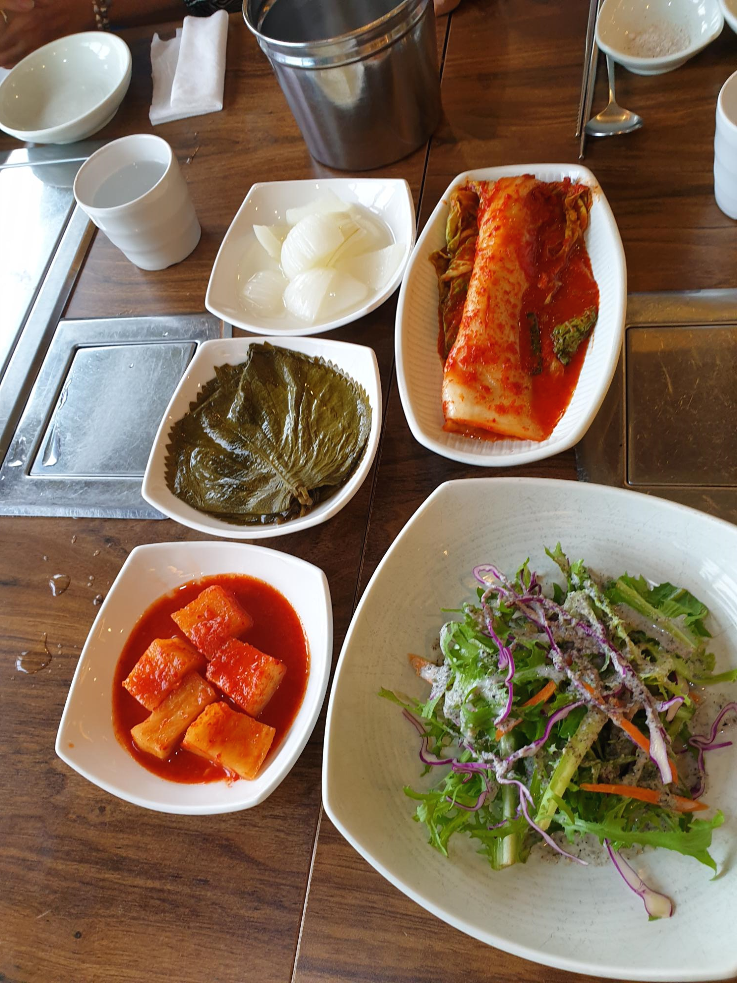 앉아서 기다리니 기본찬이 나옵니다. 샐러드와 깍두기, 배추김치, 깻잎, 양파등을 올려줍니다. 모든기본찬이 맛있습니다.
