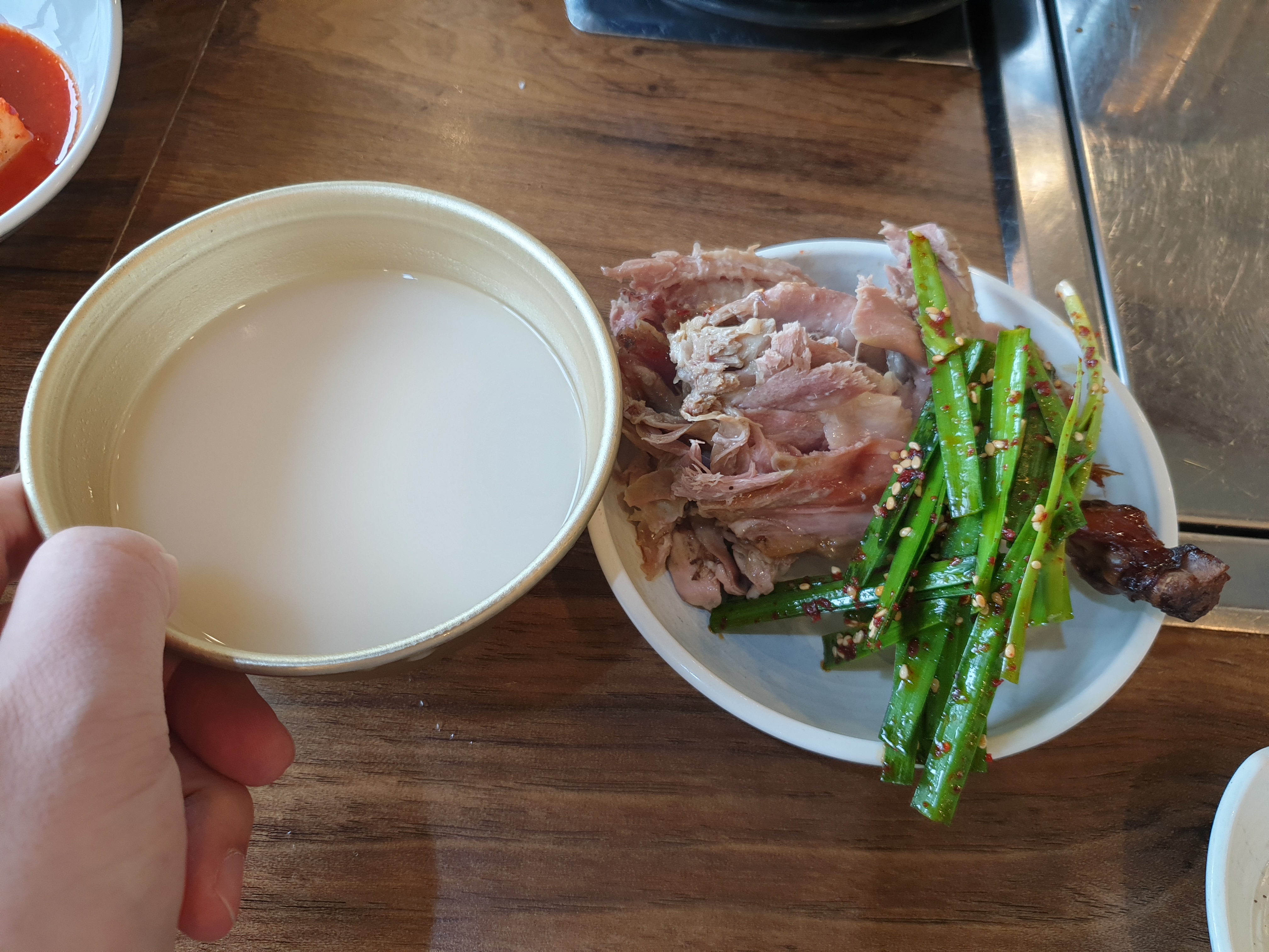산속에서 분위기도 좋고 공기도 좋고 음식도 좋고, 모든것이 좋은때 막걸리를 시켜서 기분을 UP시킵니다. 막걸리 한모금먹고 오리고기에 부추랑 먹으니 천국이 따로 없습니다.