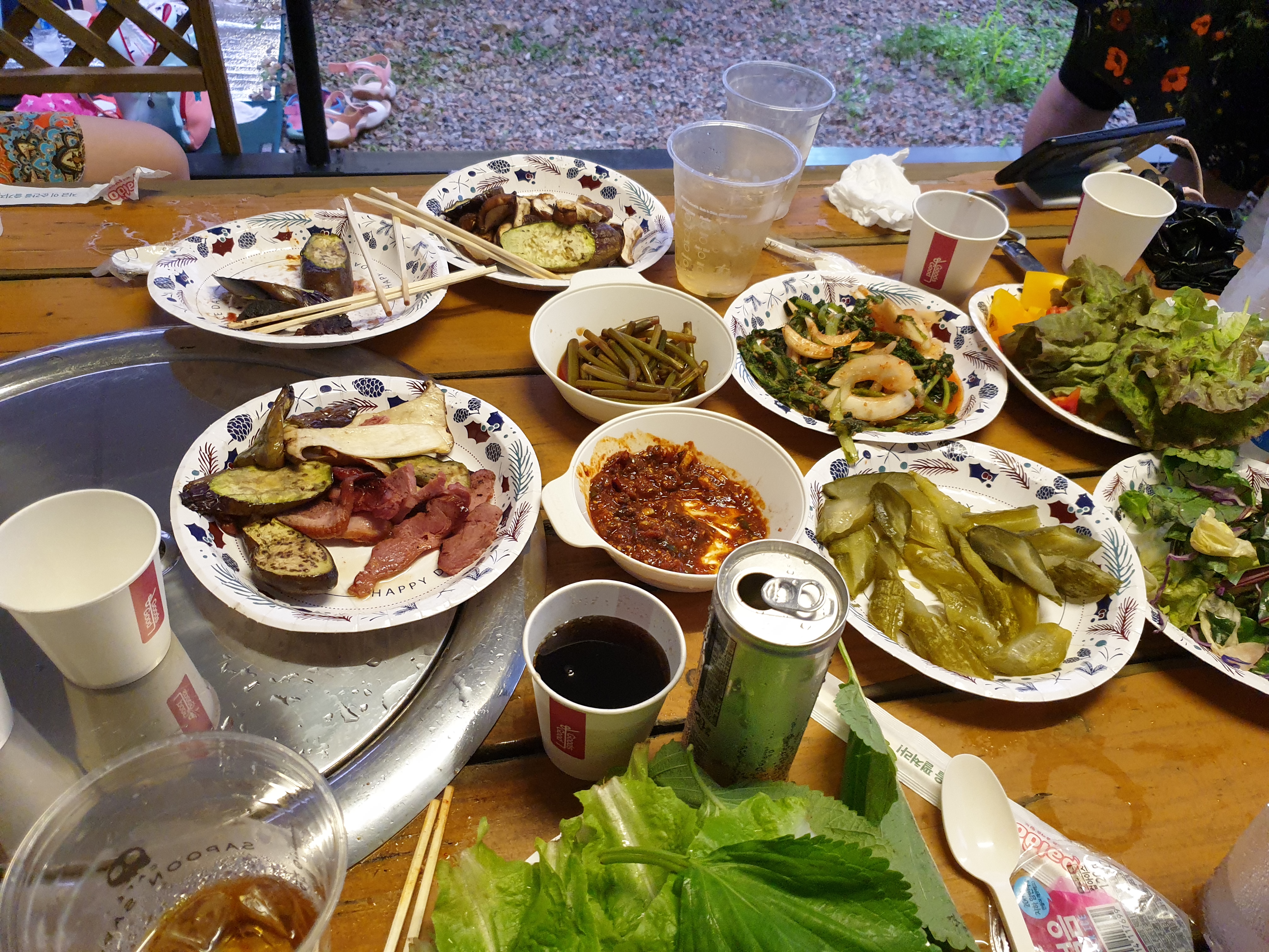 좌석은 6인이 앉을 수 있도록 되어 있으며 바베큐가 준비되는 동안 가져온 야채, 반찬, 음료, 컵등을 세팅을 합니다.