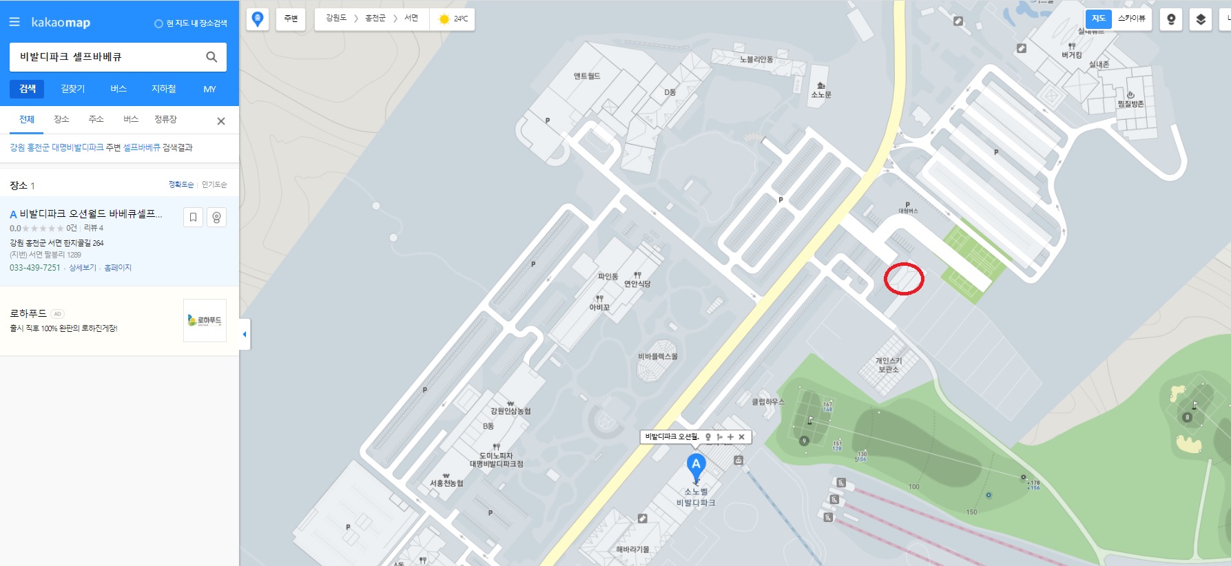 셀프바베큐가든을 지도상에서 검색하면 곤돌라를 이용하는 건물에 표시되는데 실제적으로는 빨간원으로 표시된 주차장 쪽에 위치하고 있습니다.