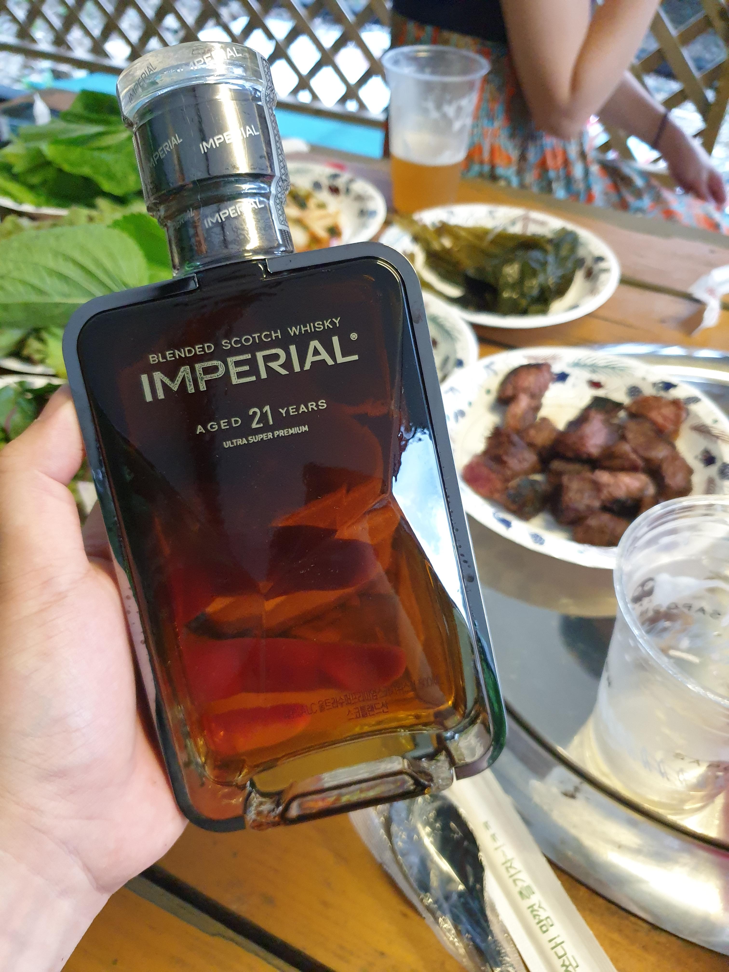 드디어 바베큐가 완성되고 둘러앉아 시식을 할 시간입니다. 이렇게 좋은 자리에 좋은 술이 빠질수가 없습니다. 어렵게 공수한 21년 숙성의 위스키를 준비합니다.
