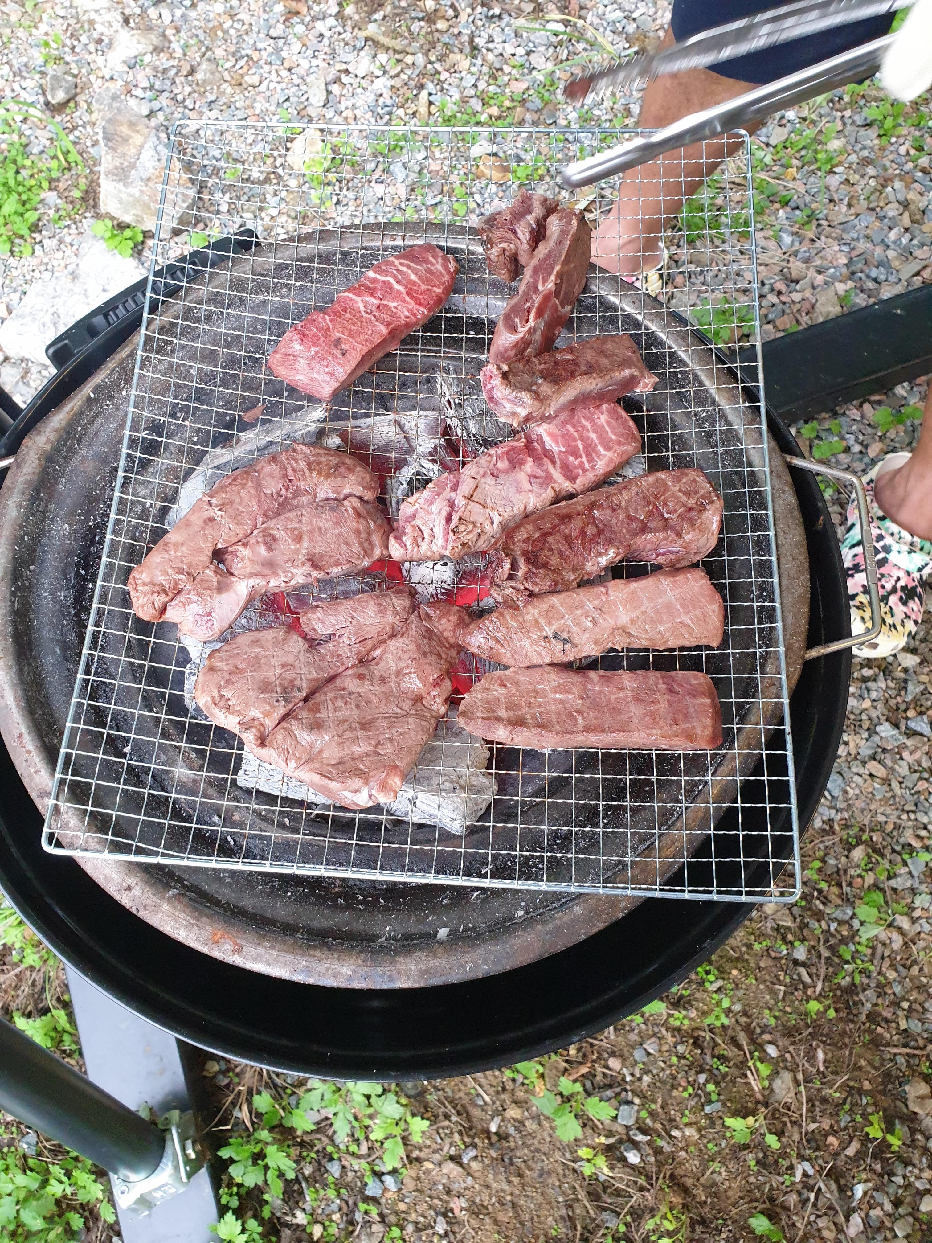 타프에 자리를 잡으면 직원분이 숯불을 올려주시고 그릴을 줍니다. 숯불의 화력이 강할때 준비한 소고기를 굽습니다. 셀프바비큐 가든에서는 숯불과 그릴만을 제공해주고 나머지 그릇, 가위, 집게, 컵 등은 모두 개인적으로 준비하여야 합니다.
