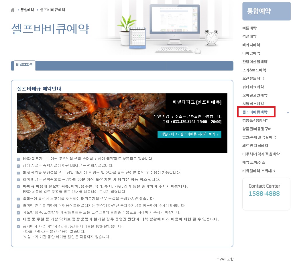 셀프 바베큐 가든은 예약제로 운영되고 있으며, 링크된 대명 소노호텔리조트 통합홈페이지에서 예약이 가능합니다.