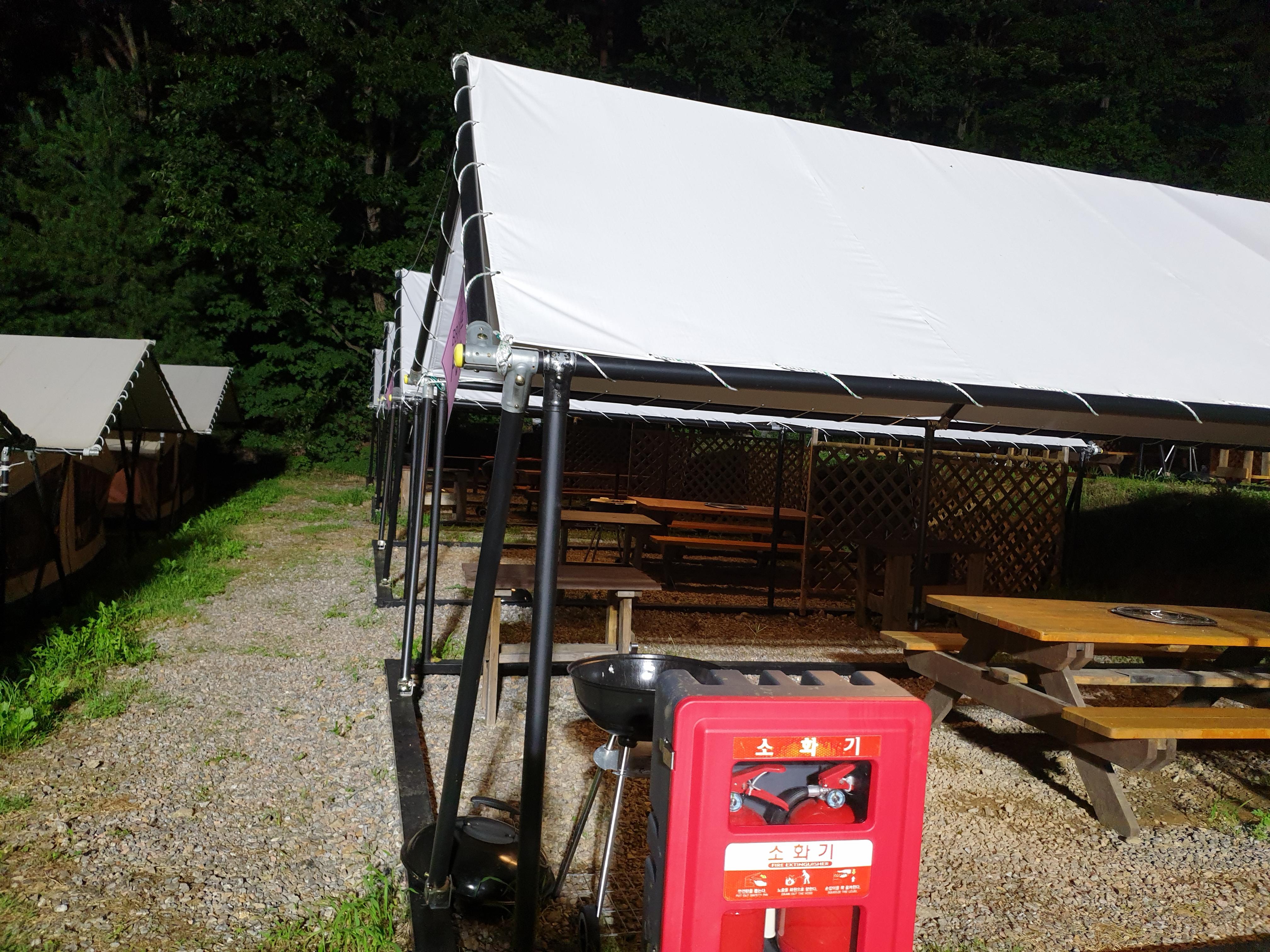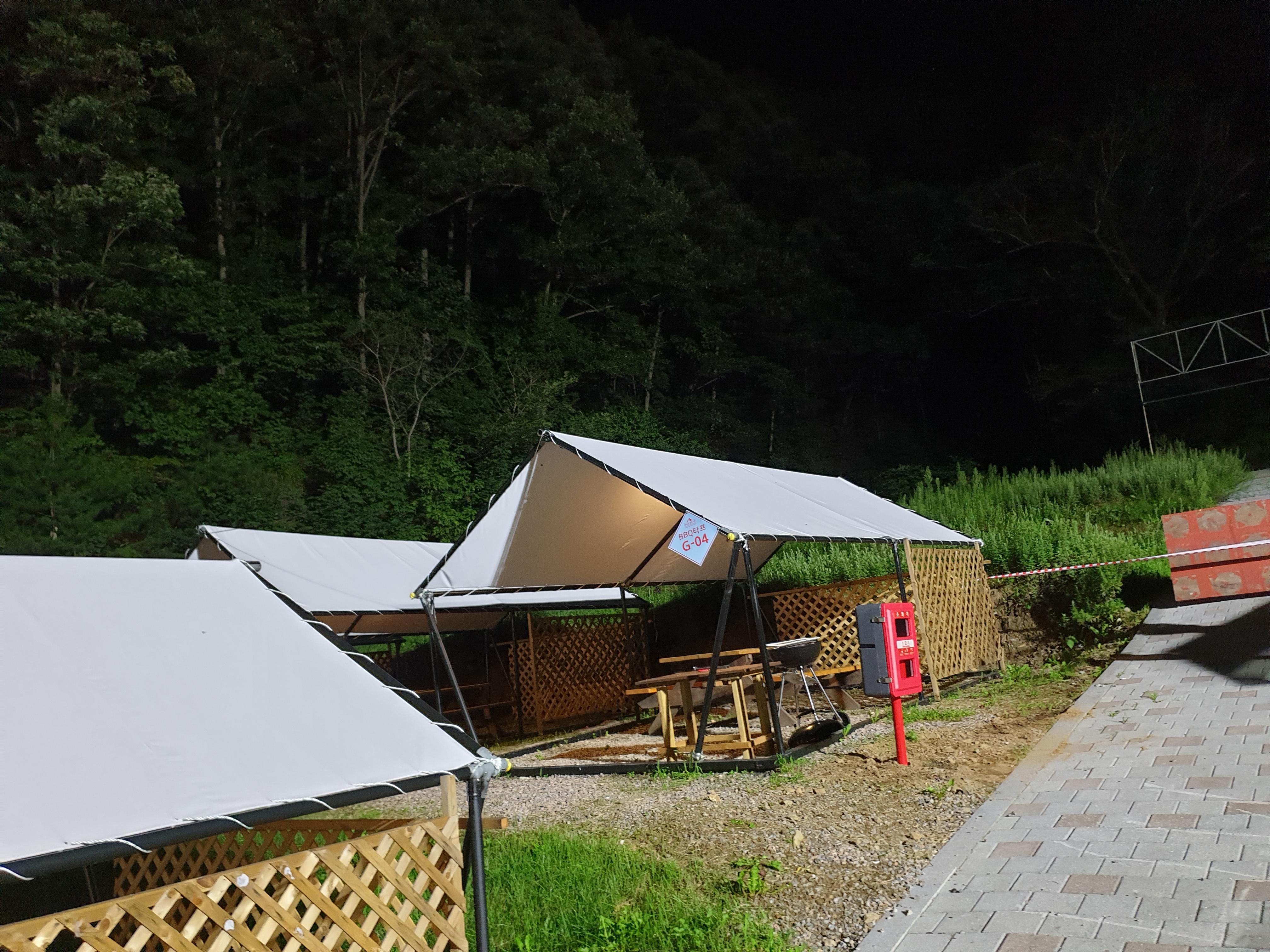 마무리를 마치고 타프의 모습을 찍어봅니다. 산속에 위치하고 있어 제법 캠핑장의 느낌을 느낄수가 있었던것 같습니다.
