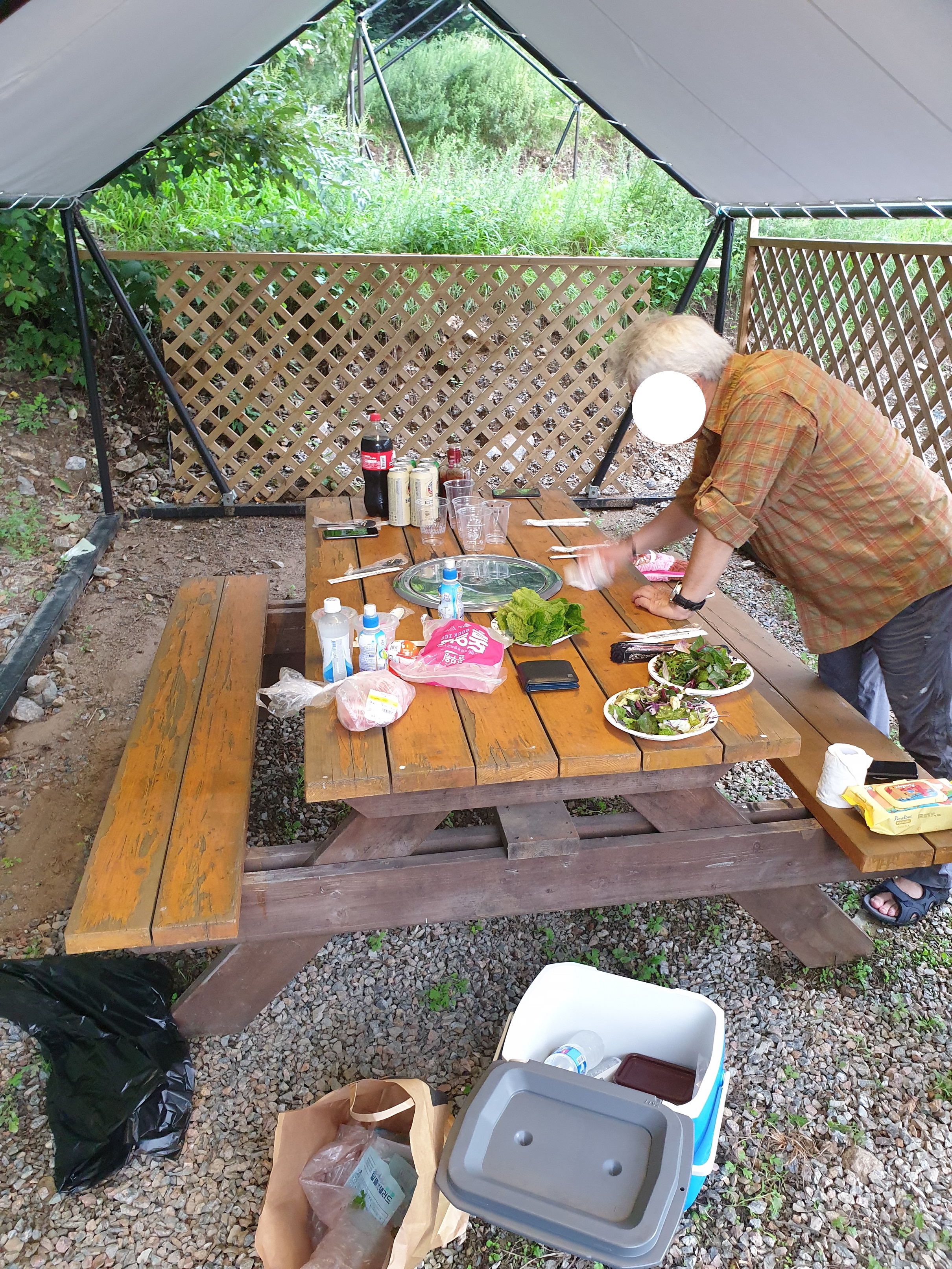 바베큐장을 보니 연기가 자욱합니다. 테이블은 한산한데 비해 타프나 카바나쪽은 사람들이 가득차있고 한꺼번에 불을 피워서인지 불이 난듯 연기가 자욱한 모습입니다.