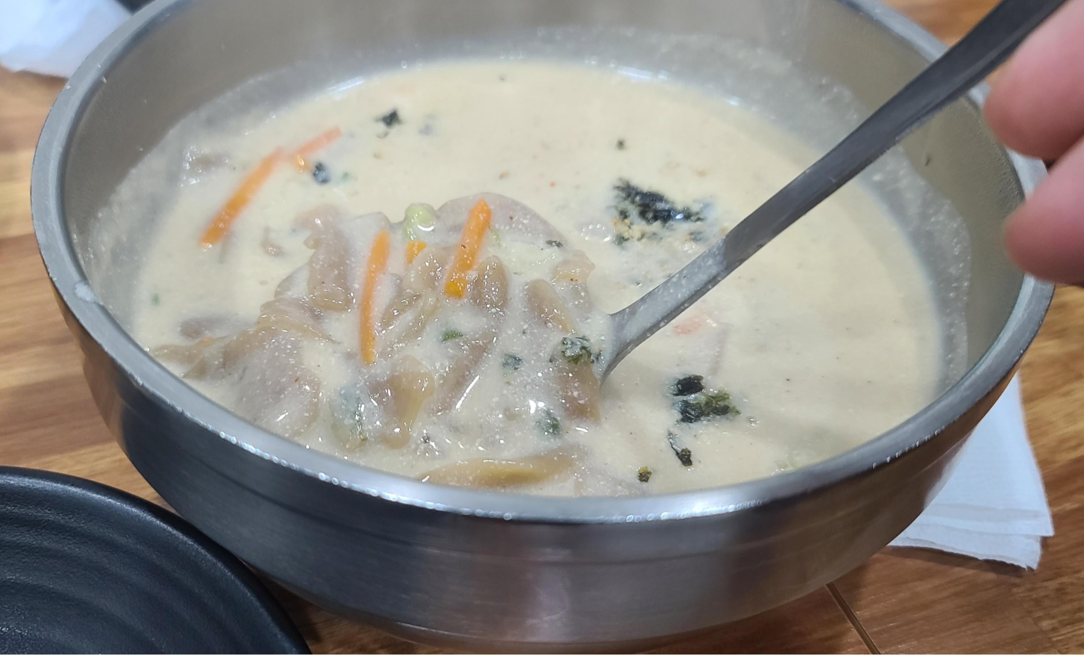 뒤이어 나온 임자탕의 먹음직스러운 비주얼을 담아봅니다. 고소해 보이는 들깨 칼국수 비주얼에 아래쪽을 휘저으니 도토리 수제비가 가득 들어있는 매우 고소해보이는 모습으로 덜어서 맛을 보니 고소함의 결정판 먹으면 먹을 수록 고소함이 배어나오며 향긋함이 마무리짓고 도토리 수제비를 씹으면 특유의 식감과 고소함이 이중 삼중으로 어우러지며 천상의 맛을 자아내고 있습니다. 역시 밑반찬부터 대표메뉴, 서브메뉴에 이르기 까지 무엇하나 빠지지 않는 이러한 구성이 줄서서 먹는 맛집을 만드는 것이며 사람들이 계속찾게되는 힘이라는 것을 깨닫게 됩니다.
