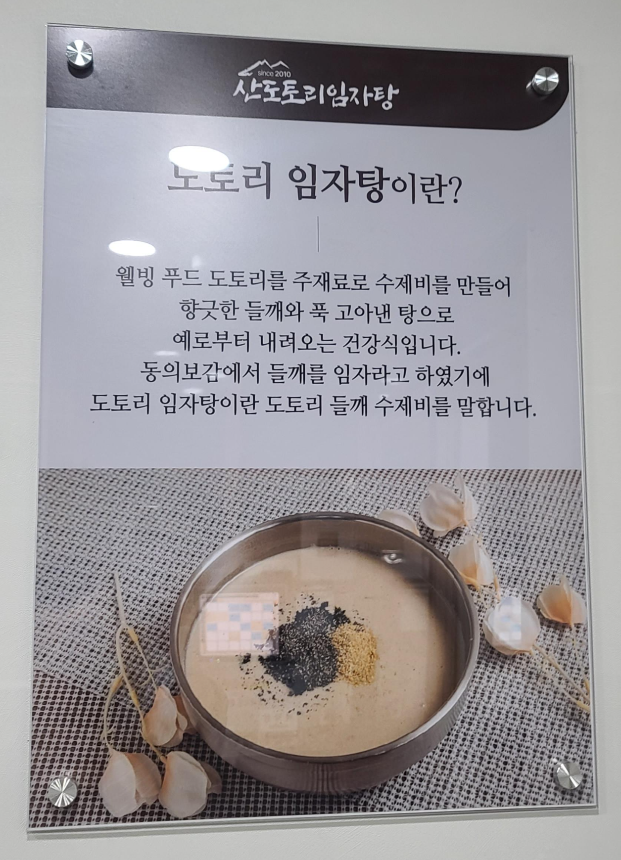 자리를 잡고 메뉴를 살펴봅니다. 도토리임자탕이 가장 위에 있는 것으로 보아 대표메뉴이며 그외 도토리쟁반국수, 도토리묵, 도토리전 등 도토리를 이용한 다양한 메뉴가 눈에 들어옵니다. 도토리 임자탕의 메뉴 설명을 보니 도토리를 주재료로 수제비를 만들어 향긋한 들깨와 푹 고아낸 탕으로 동의보감에서 효능을 설명하며 건강식에 대한 홍보를 하고 있는 것이 보입니다. 가장 대표적으로 보이는 위에있는 두메뉴 임자탕과 쟁반국수를 주문하고 기다려봅니다.