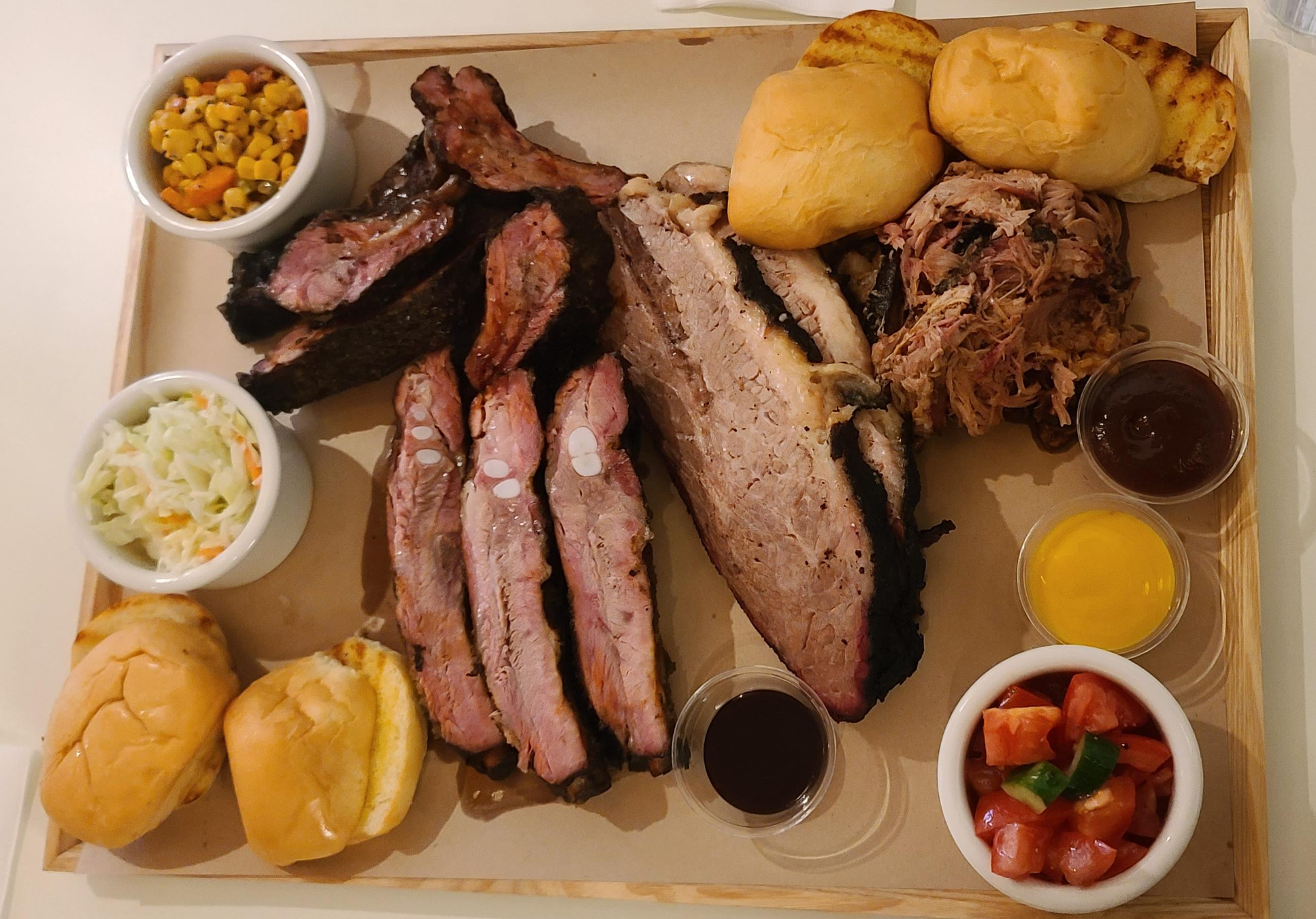 잠시 기다리자 푸짐해 보이는 패밀리 플래터가 모습을 드러냅니다. 패밀리 플래터는 7가지의 바베큐중 4가지를 선택하여 즐기는 메뉴로 순서대로는 아래와 같으며 상위 4개 메뉴를 선택하여 준비된 메뉴의 모습입니다. 바베큐 외에는 함께 곁들일 빵과 코울슬로, 콘샐러드 그리고 토마토 살사가 곁들여져 있어 다양한 조합으로 즐길 수 있게 구성한게 참으로 참신해 보입니다.
