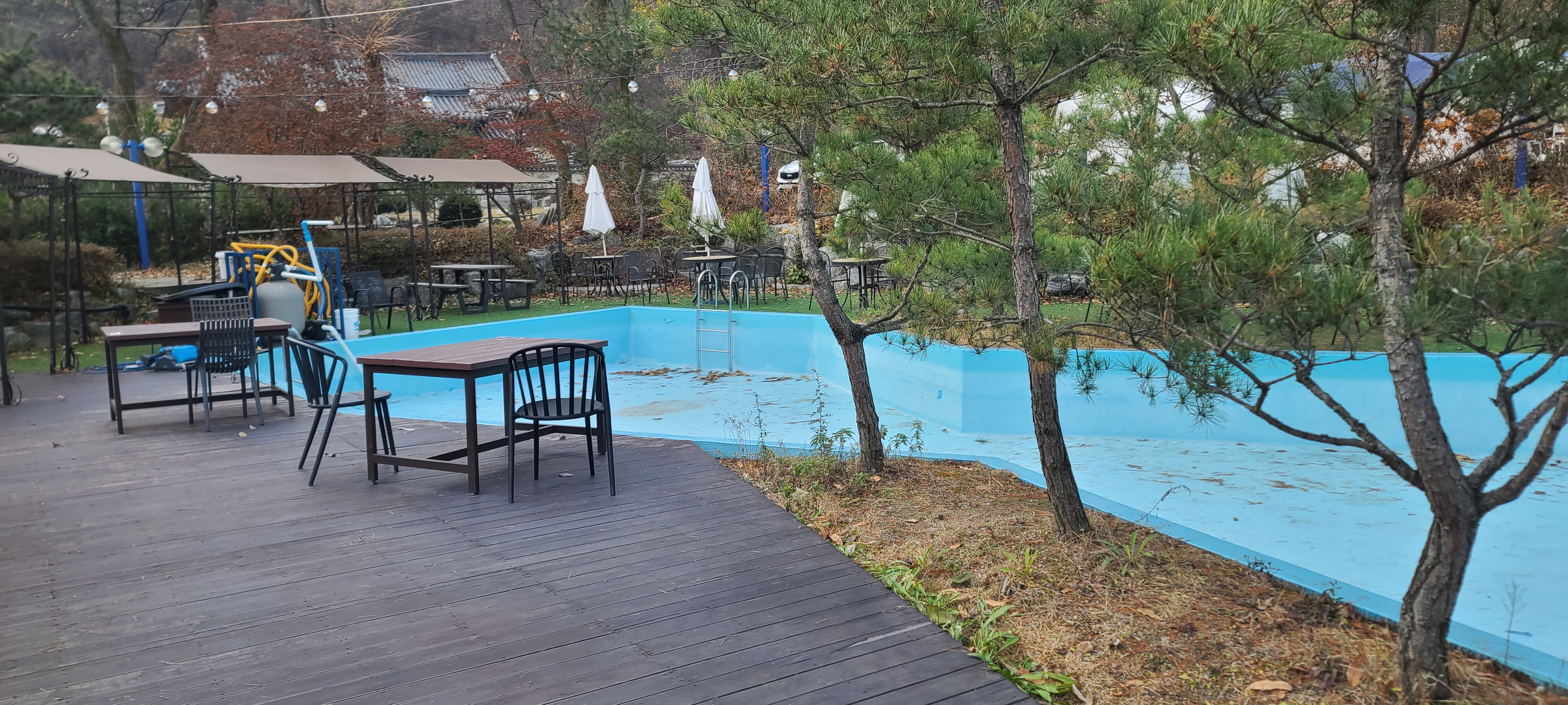 정면 건물에서 좌측으로 올라가다보면 야외 수영장이 눈에 들어오고 있습니다. 초겨울 시즌이라 물을 다 빼놓은 모습이지만 규모가 크고 애견동반 수영장 까지 갖추어 놓았다니 참으로 모든 것을 한번에 즐길 수 있는 올인원 타입의 아메리칸 스타일 레스토랑이구나 하는 생각이 듭니다. 수영장은 별도 요금이 있으며 여름에 한번 와서 즐겨보고 후기를 남겨봐야겠다는 생각을 해보게 됩니다.