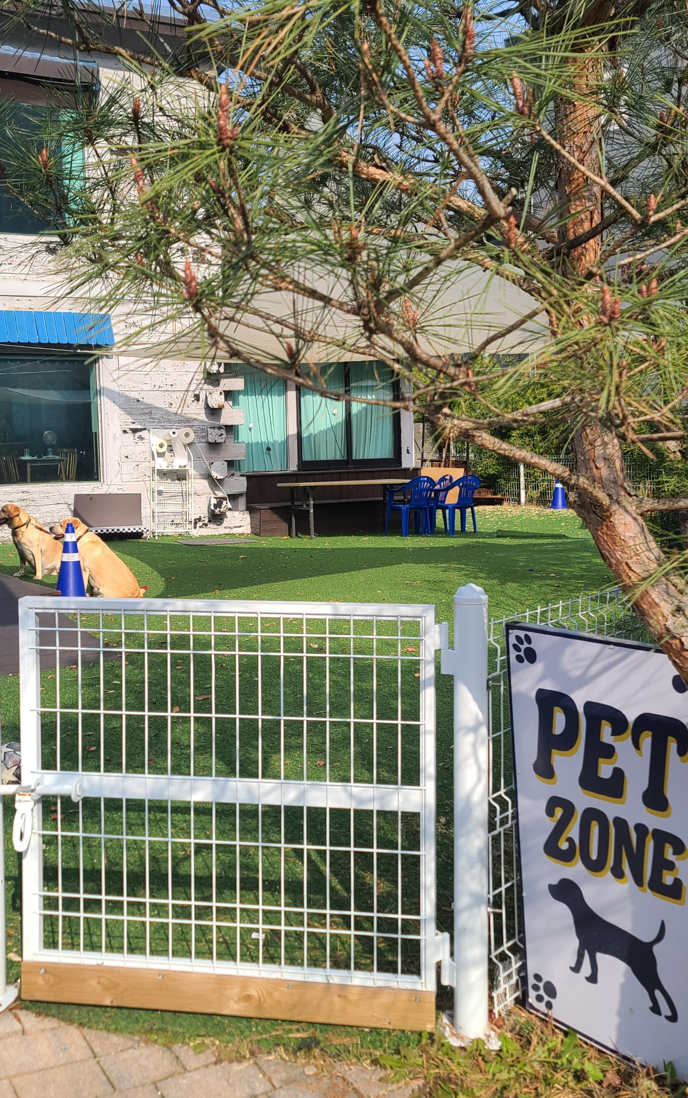 루이스타운 정문 레스토랑 오른편으로는 별도의 출입구가 있고 PET ZONE이라고 표시된 애견 놀이터가 구성되어 있습니다. 인조잔디가 깔려져 있어 푹신하고 뜀틀, 고리, 벤치 등 각종 애견용 놀거리가 설치된 장소로 커피나 차를 한잔 하면서 반려견과 재미있게 놀 수 있는 카페와 같은 구성입니다.