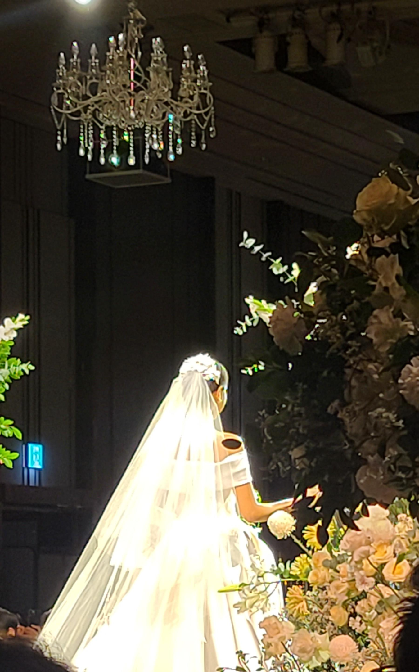 결혼식이 시작되고 하이라이트인 신부입장 화려한 샹들리에와 화이트 드레스 그리고 정원을 연상케 하는 꽃들이 어우러져서 참으로 보기좋은 웨딩 분위기를 연출하고 있습니다.