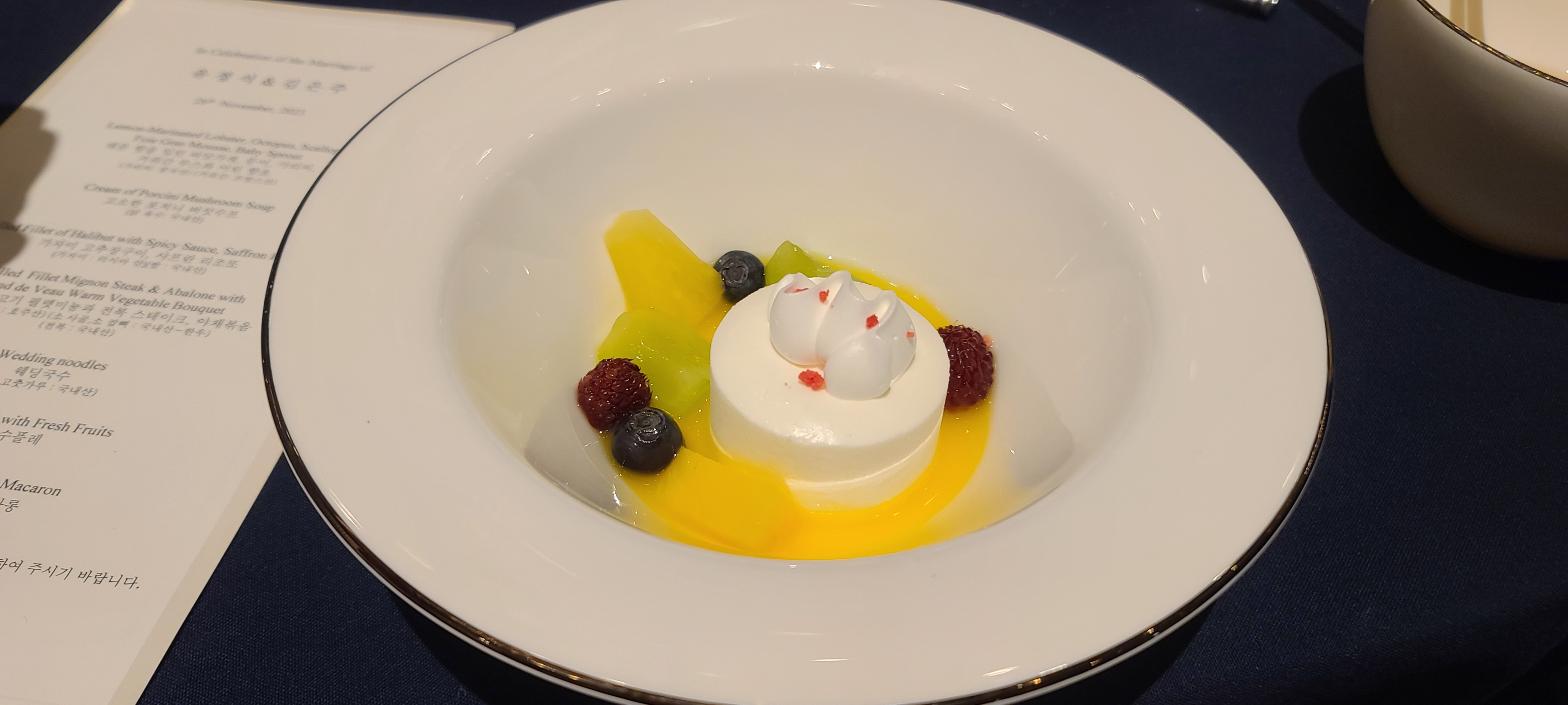 국수를 비우자 다음코스는 요거트 수플레가 나왔습니다. 생크림아래 과일소스를 깔고 산딸기, 블루베리, 파인애플 등 다양한 과일을 가니쉬로 마무리한 비주얼이 참으로 아름다워보입니다. 맛을보니 부드러운 크림맛과 상큼한 과일의 조화가 참으로 좋았으며 입맛을 산뜻하게 만들어주는 디저트의 역할을 훌륭히 수행해 내고 있습니다.