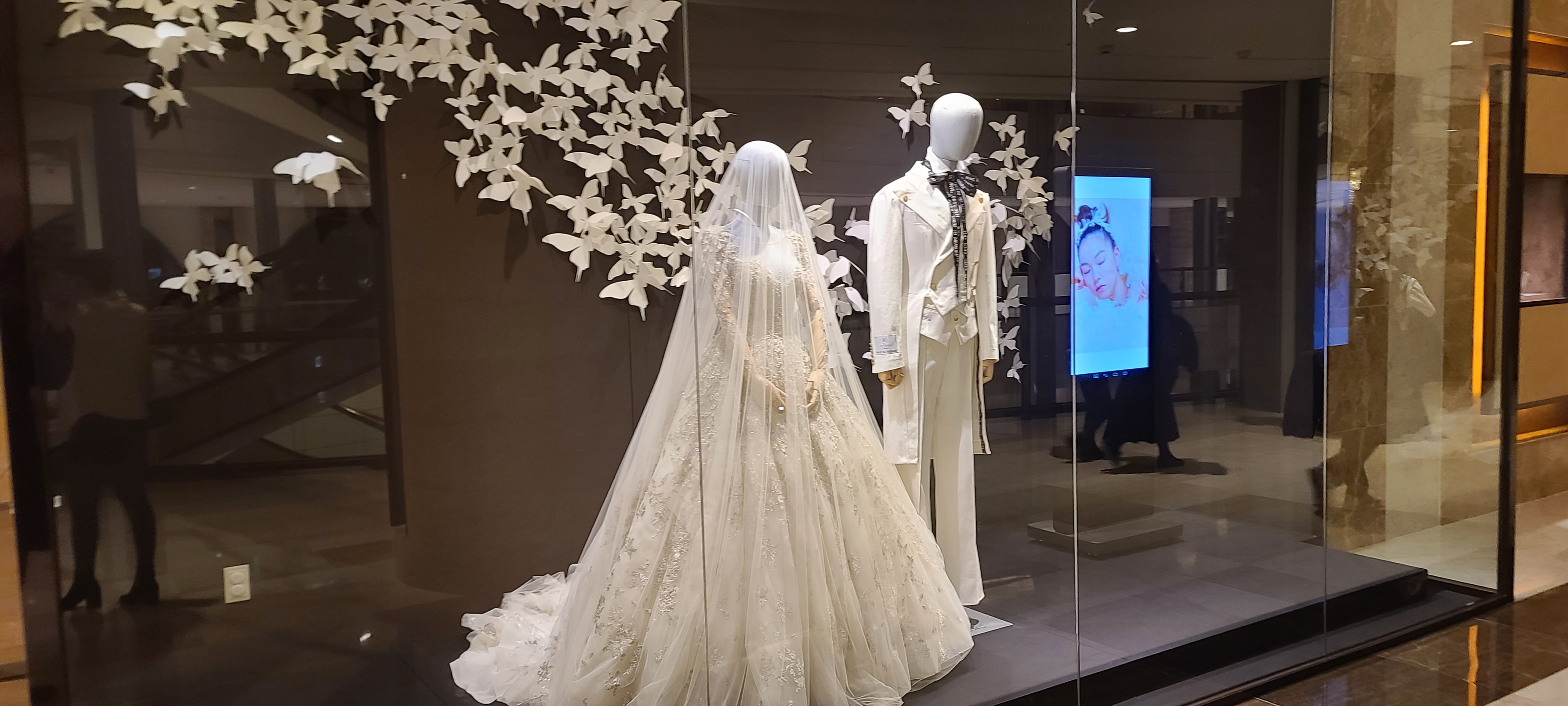 주차를 빨리 마무리한 덕분에 시간적인 여유가 생겨 웨딩홀 이곳 저곳을 둘러보고 무엇이 있나 살펴봅니다. 화이트 드레스와 턱시도의 아름다운 모습과 나비를 형상화한 장식이 순백의 고결한 느낌과 무척 아름답다고 느껴지게 만드는 구성으로 결혼식을 구경온 미혼 남녀 혹은 그 부모님들에게 롯데호텔에서 결혼하고 싶게 만드는 욕망을 자아내게 하고 있습니다.