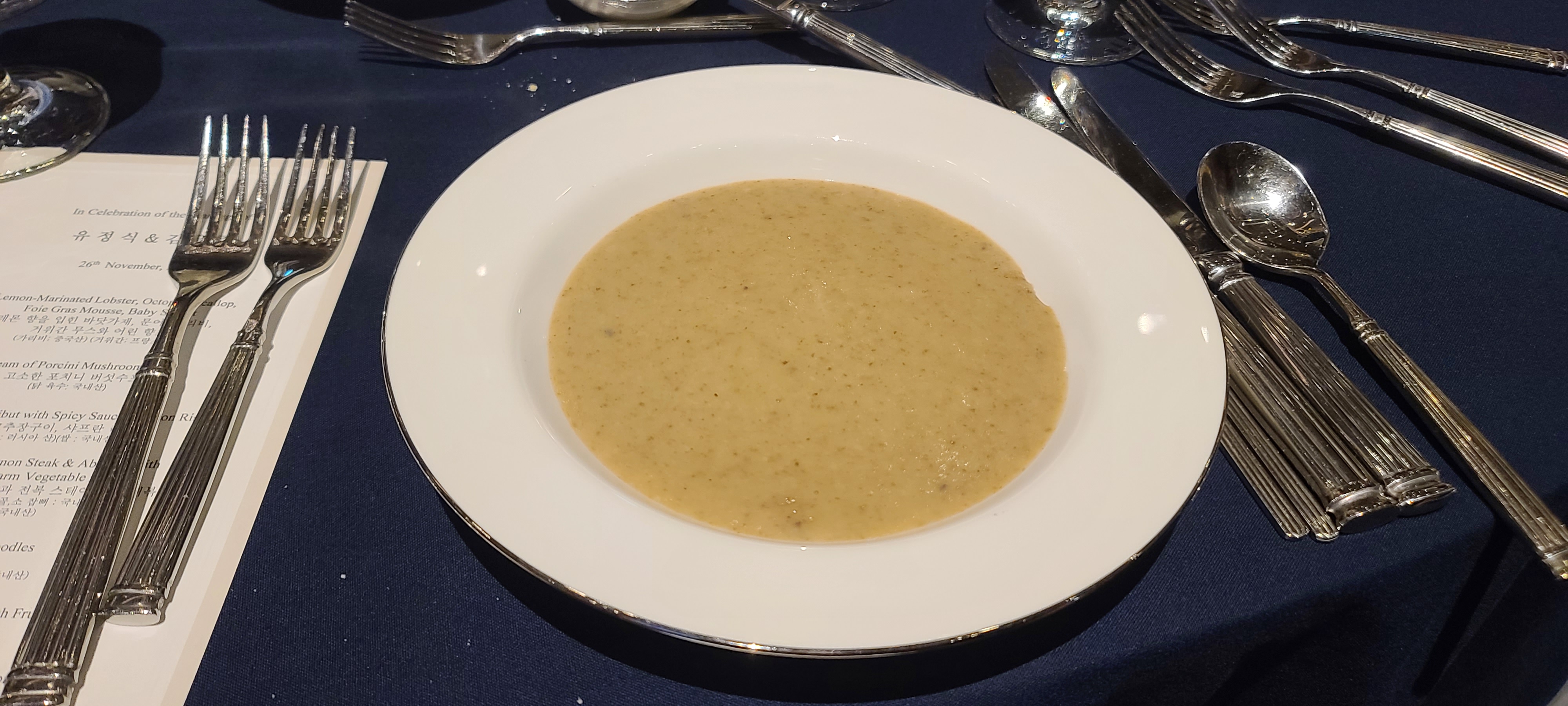 스테이크를 마무리하니 웨딩 국수가 다음코스로 나왔습니다. 전통적인 결혼식에서 국수를 먹는것에 찾안해서 나온 코스인것 같은데 과연 서양식 코스에 국수가 어울릴까 하는 우려반 설레임 반으로 맛을보니 면은 생각보다 탄력이 없어서 별로이지만 국물은 상당히 맛있게 느껴지는 것을 깨닫게 됩니다. 면은 대량으로 만들기 때문에 탄력은 어쩔 수 없다고 하지만 국물이 심심한듯 하면서도 감칠맛이 느껴지면서도 조미료맛은 아닌거 같고 상당히 신기한체험에 도데체 어떻게 만들었을까 생각하며 국물을 다 비워버리게 됩니다.