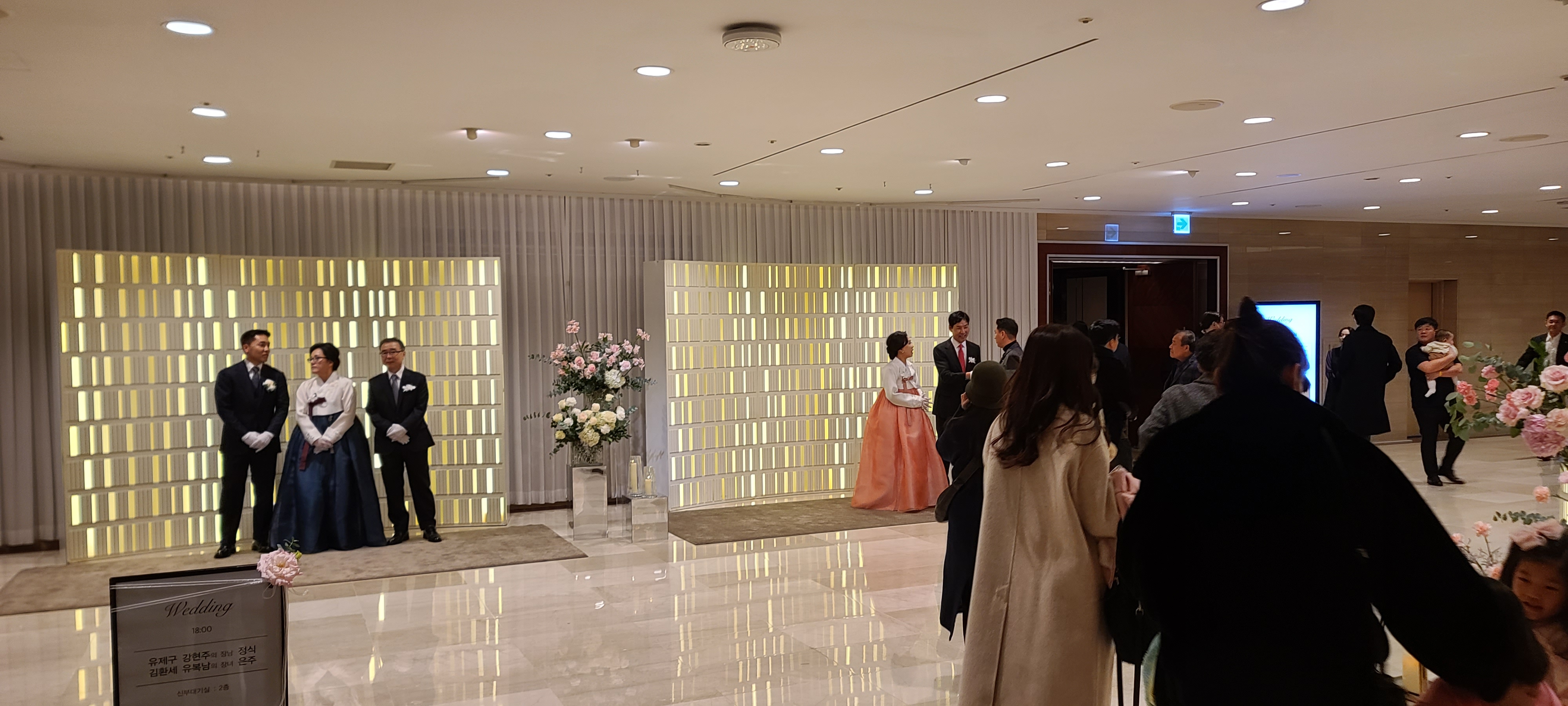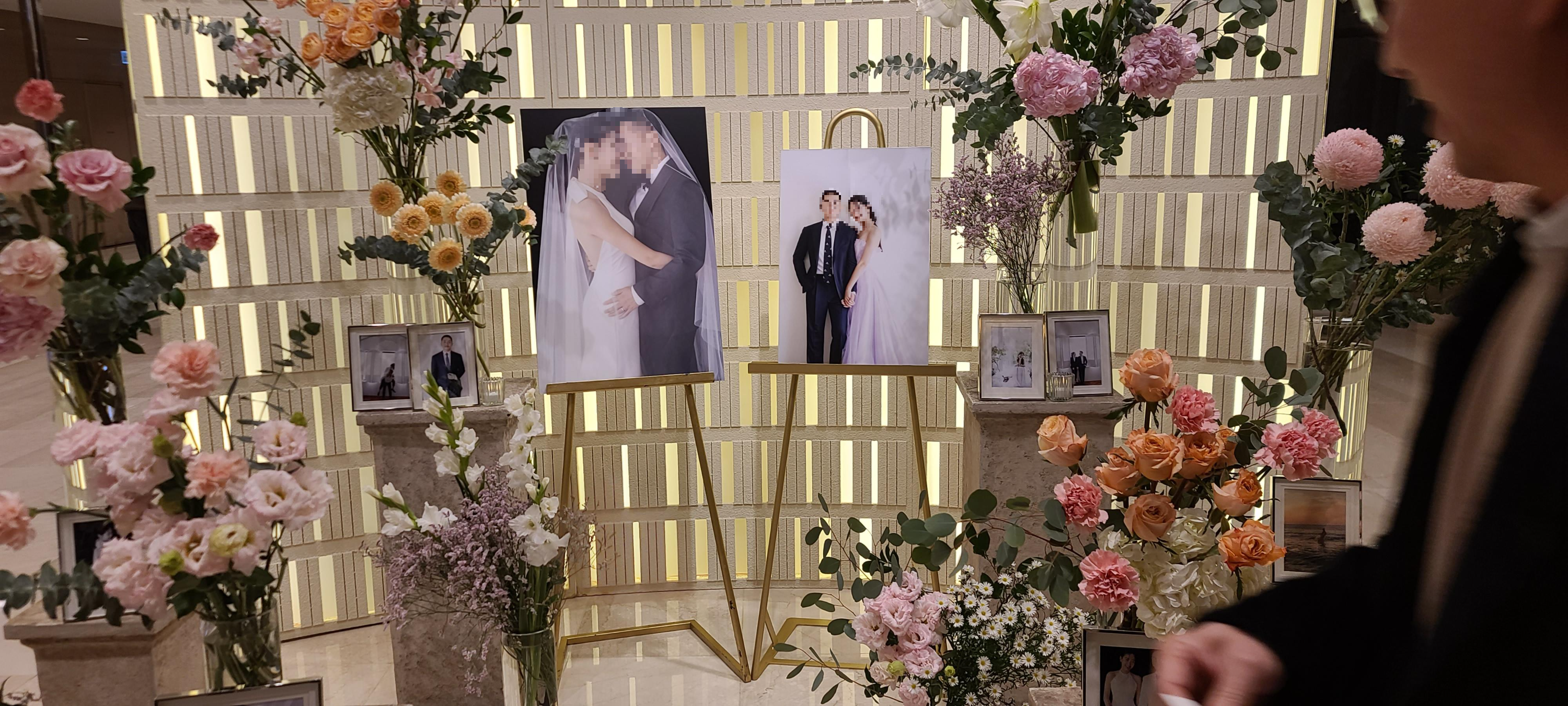 웨딩이 시작되는 크리스탈볼룸에서 이것저것 둘러보며 어떻게 결혼식을 준비했는지 살펴봅니다. 생화가 가득한 포토테이블과 신랑 신부 가족들이 손님을 맞이하는 장소 모두 밝은 조명과 고급진 대리석으로 빛이 반사되게 구성되어 있어 고급스러움이 가득해보여 사진을 찍어도 잘 나오고 호텔 결혼식이라는 고급스러움이 잘 묻어나는 것이 느껴지고 있습니다.