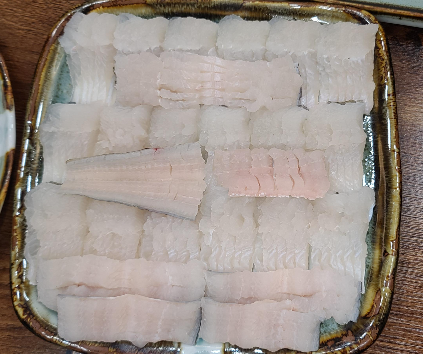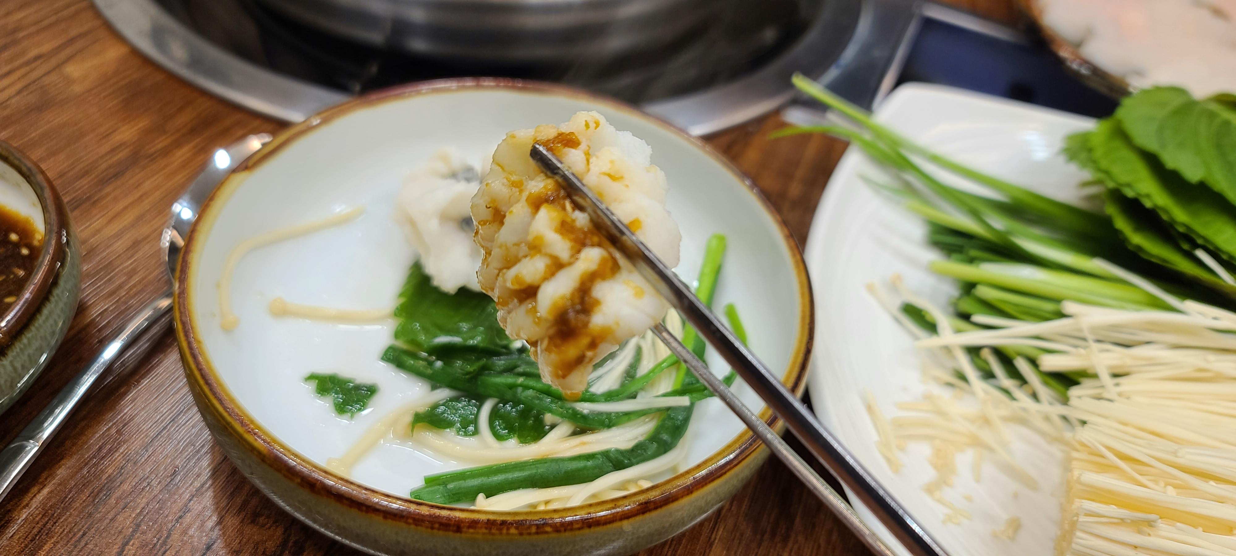 그래도 먹는데에 집중을 하자는 마음으로 냉정을 되찾으며 기다리던 하모 샤브샤브를 맞이합니다. 장어뼈를 우려서 만들어낸 진한 국물에 대왕 바다장어인 하모를 먹기 좋은 크기로 잘라서 세팅해 놓은 모습입니다.하모는 칼집을 촘촘하게 넣어서 뼈를 제거한 모습이 참으로 솜씨가 좋아보이고 있습니다.