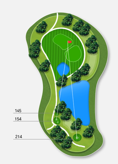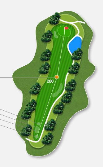 우 도그렉 홀이기 때문에 페이드로 공략을 할 수도 있지만 세컨샷이 나무에 가려져서 혹시나 어려워질수도 있는 리스크를 예방하기 위해서 좌측 끝 티샷라인에서 드로우로 티샷을 공략하는 모습입니다. 비록 그린에서는 멀어져도 이렇게 하면 시야가 밝아지기 때문에 세컨샷을 공략하기가 한결 수월해지는 장점이 있습니다.