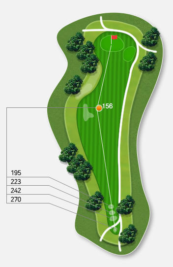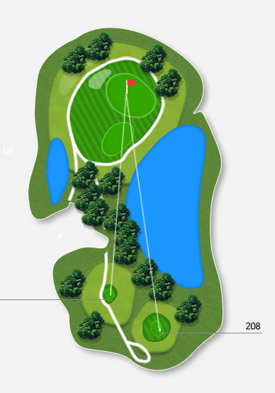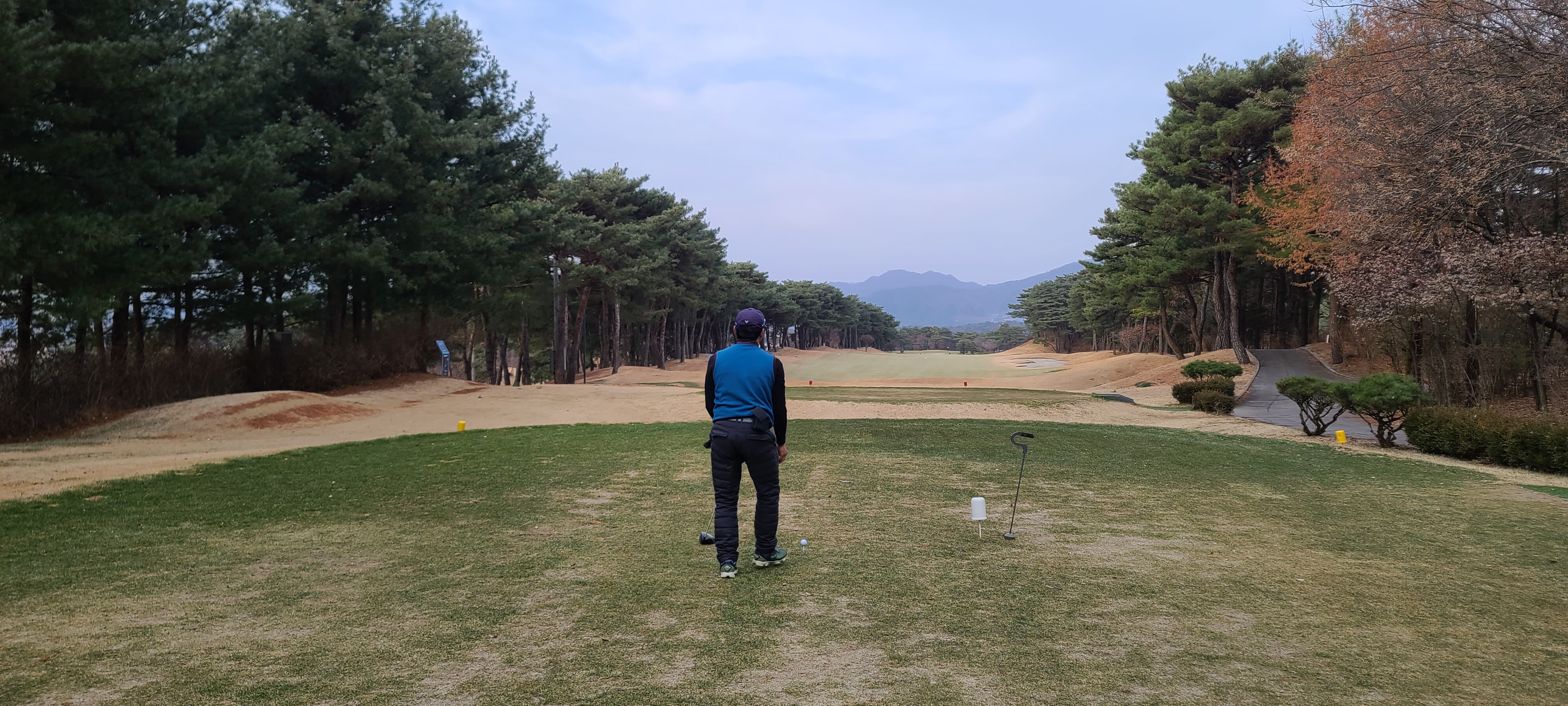 마운틴 코스 5번 380m 거리의 비교적 먼 파4홀입니다. 직선형으로 별다른 어려움은 없어보이지만 티잉 그라운드 오른편에 높이 솟아오른 나무로 시야를 가리기 때문에 압박감을 주고 당겨치게 본의아닌 무의식적 긴장감을 유발시킬 수가 있습니다.