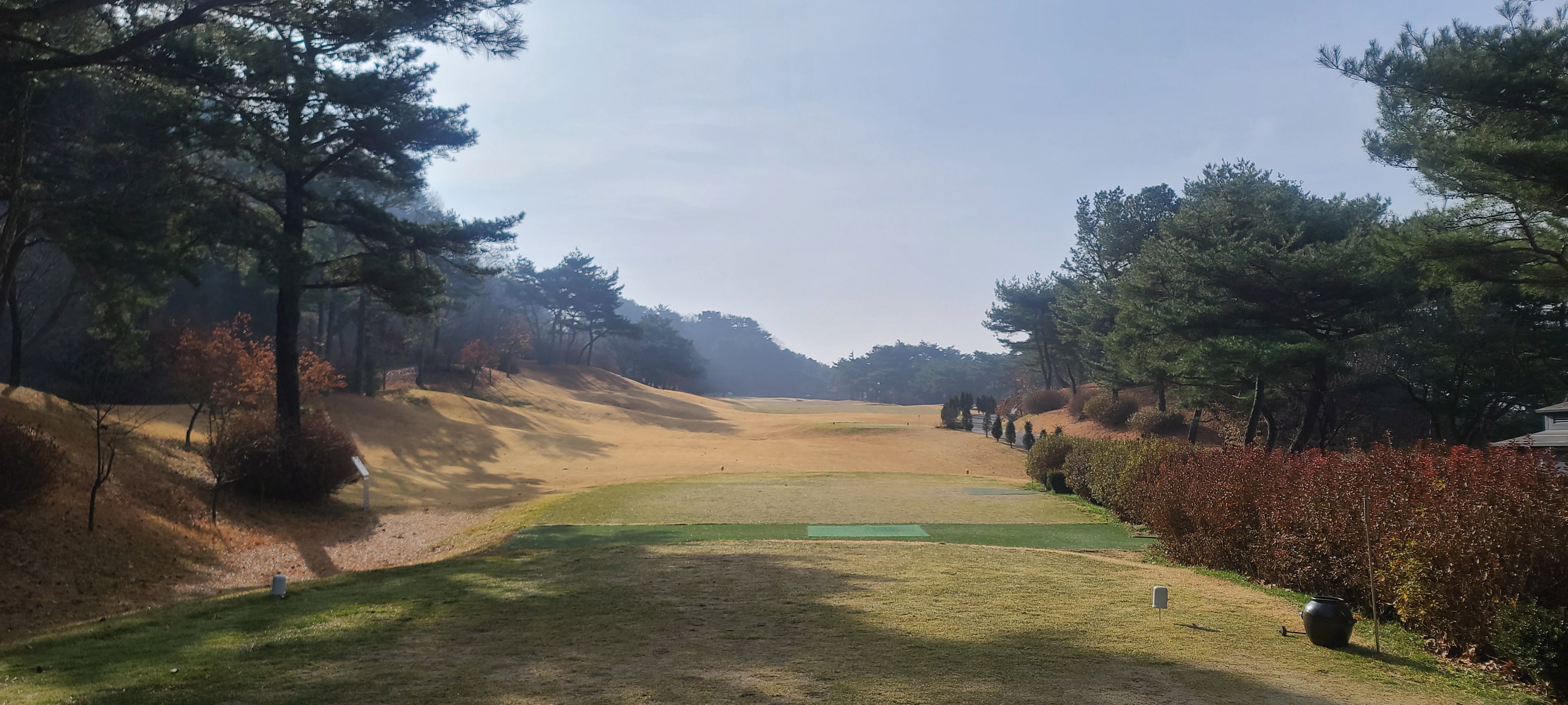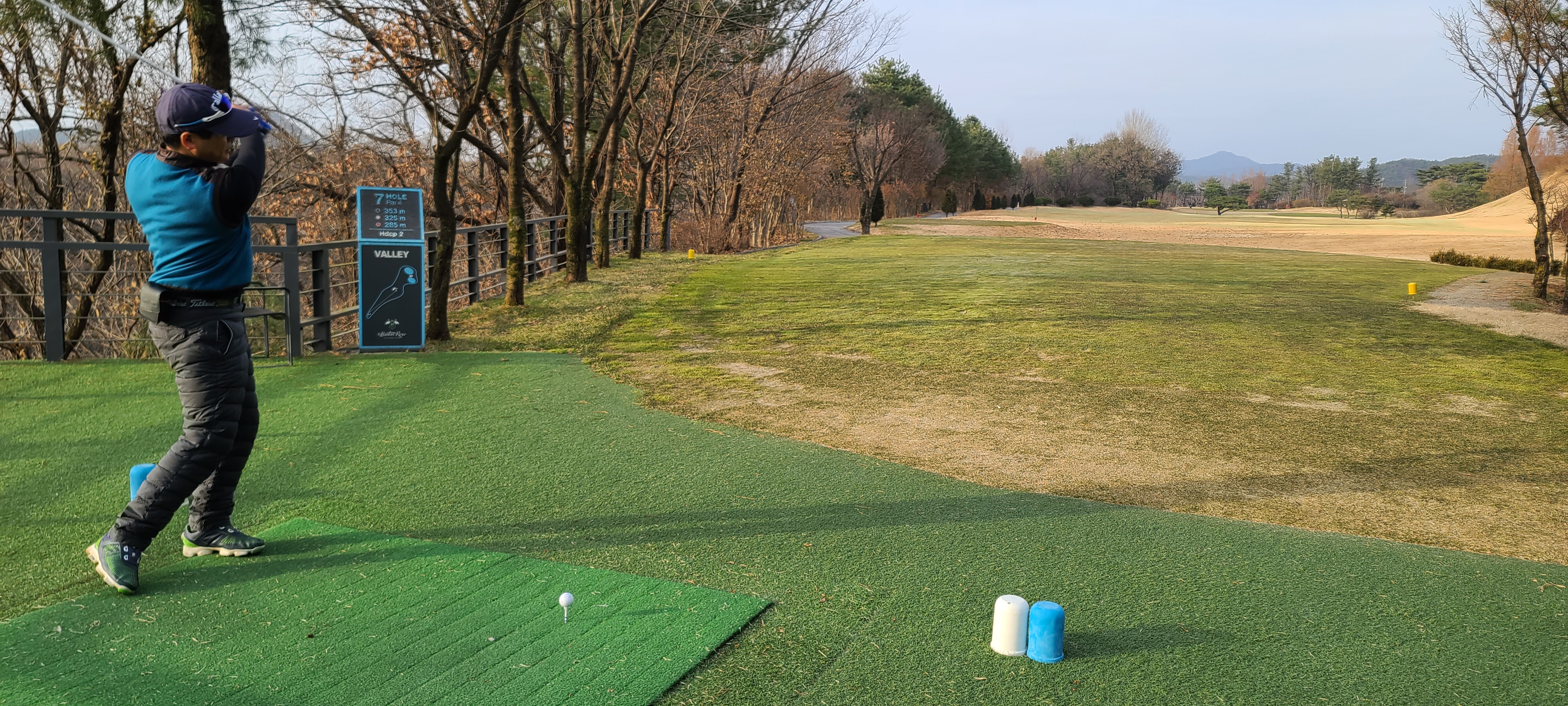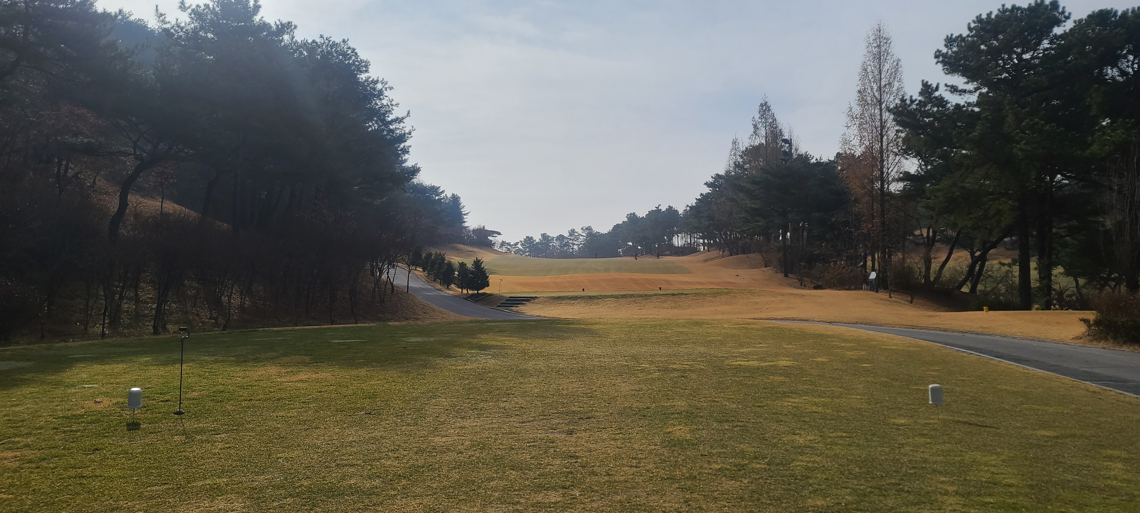 밸리 7번 325m 거리의 짧은 홀 플레이어 시점에서 필드를 촬영해보니 넓게 펼쳐진 페어웨이와 직선형 코스가 원온이라도 노릴 수 있을만큼 밝은 시야와 자신감을 심어주며 빗나갈 곳이 없다라는 안정감마저 심어주는 것이 보입니다. 어려운 코스가 마운틴부터 초반에 계속되더니 후반에는 마음의 안정을 찾으라는 듯 쉽게 펼쳐지는 모습이 참으로 인상적입니다.