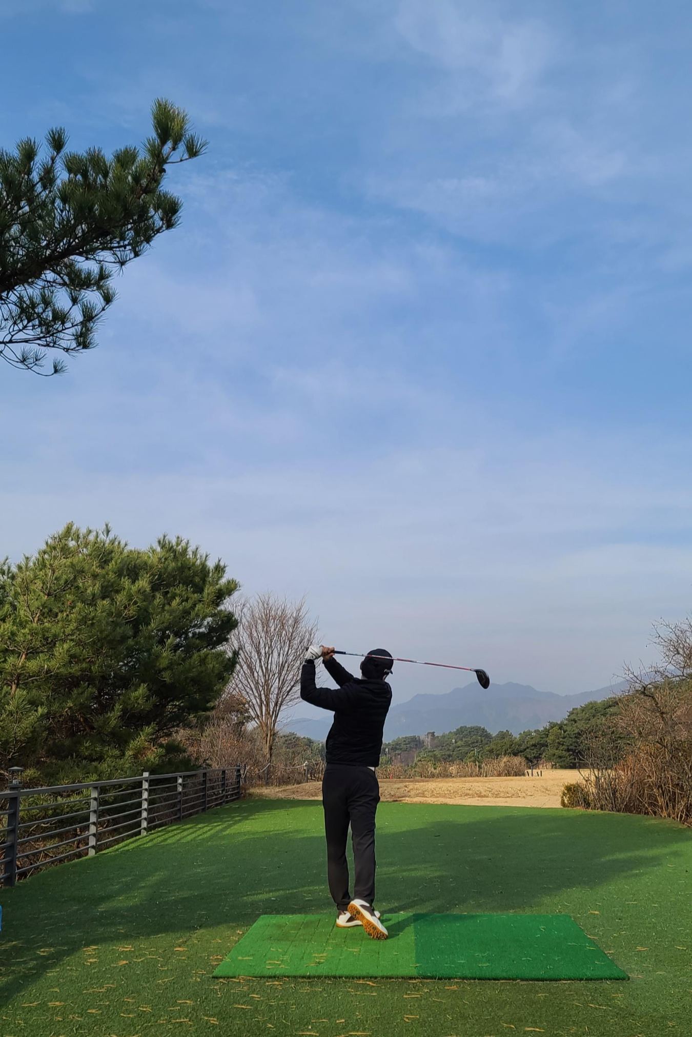 공략법으로 티샷구역 최대한 왼쪽에 서서 시야를 확보한 후 페이드로 공략하는 모습을 담아봅니다. 역시 골프장을 다니다보면 어려운 곳은 극복하는 재미가 있고 이런것 때문에 페어웨이는 넓은데 어려운 골프장이 인기가 많은 것이라는 것을 깨닫게 됩니다.