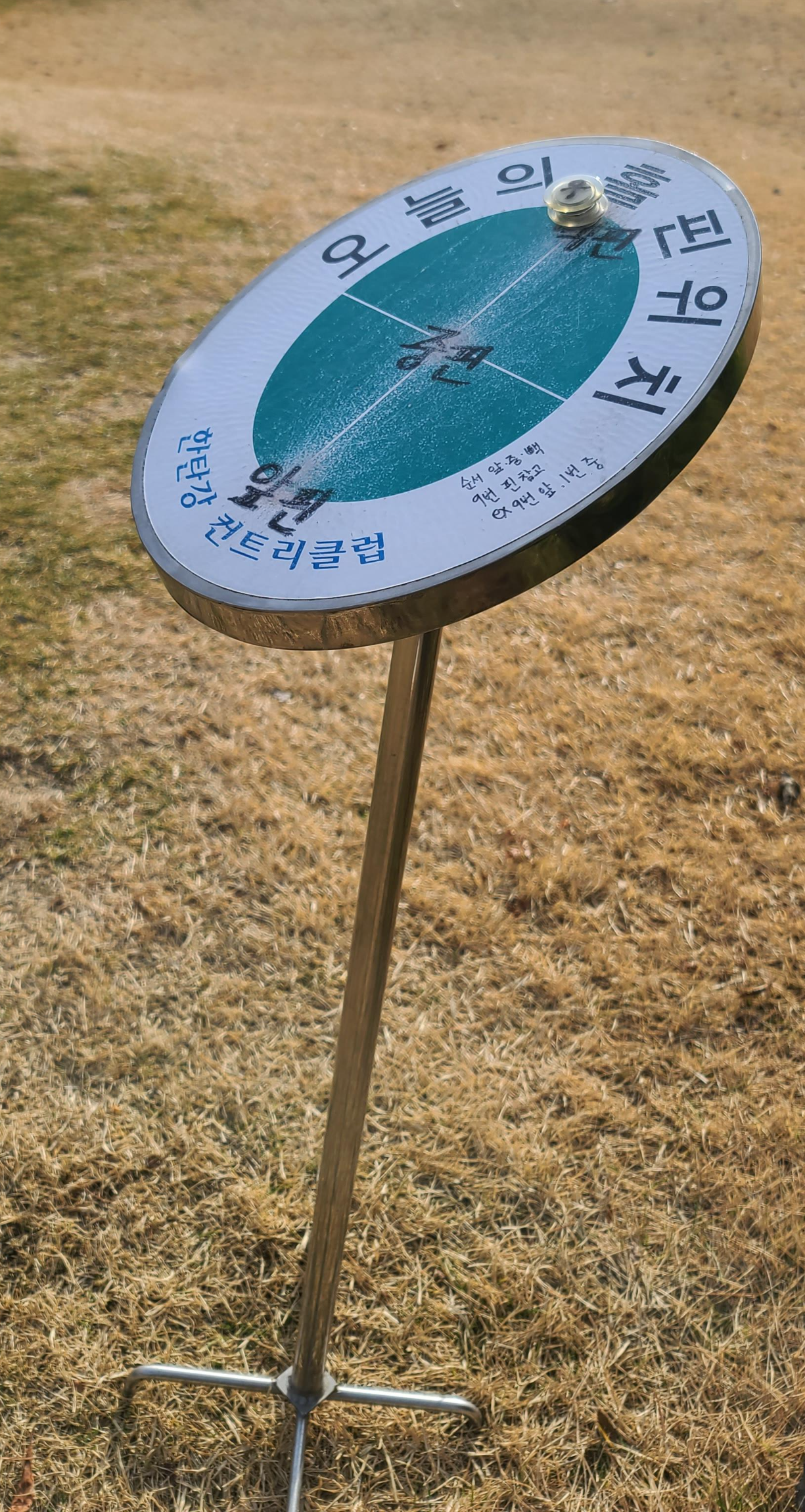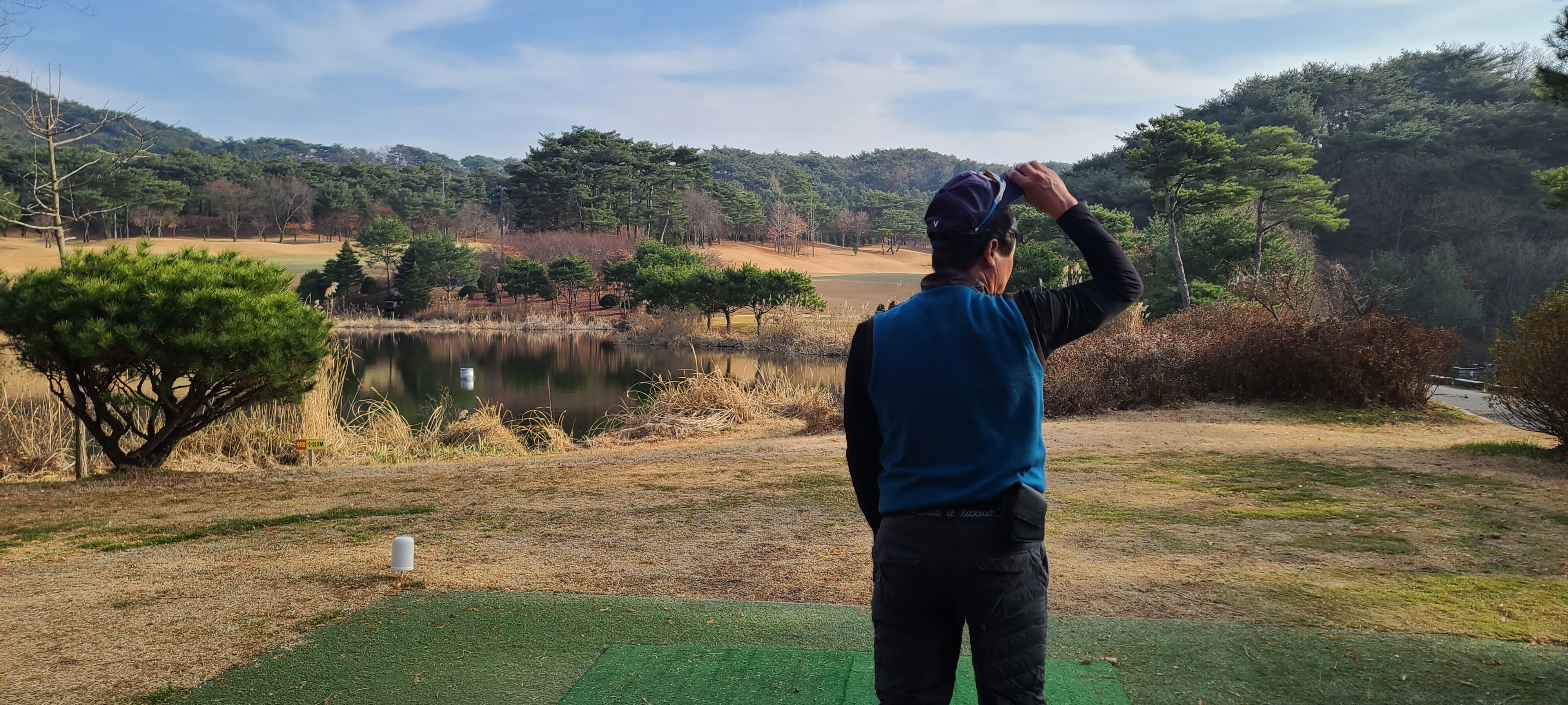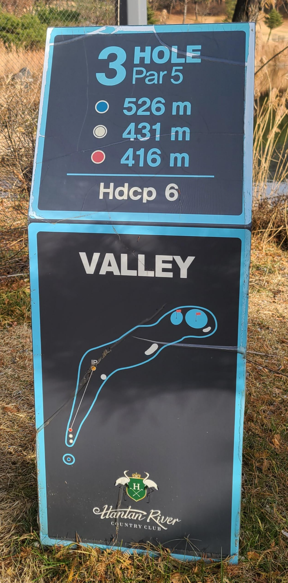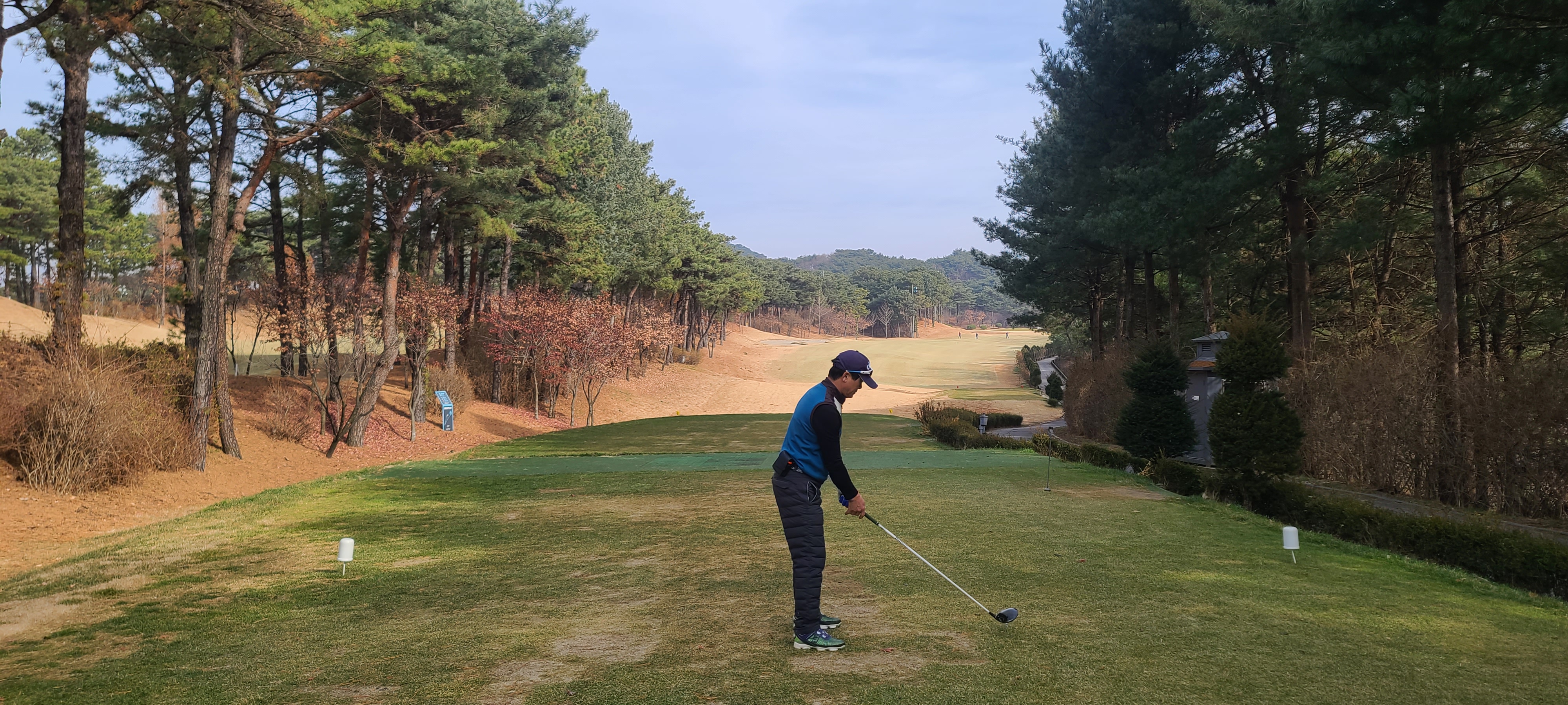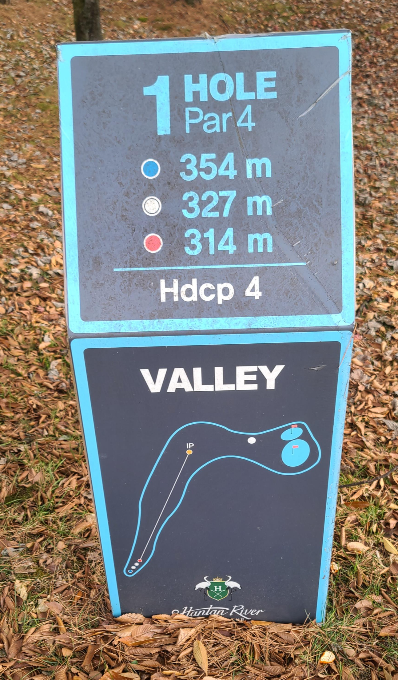 후반전은 밸리코스 시작 추운 몸을 풀고 1번홀 파4 부터 다시 시작을 합니다. 우측 완전히 기울어진 도그렉홀로 거리는 327m로 짧지만 방향이 보이지 않아 왼쪽 방향으로 티샷을 해야 세컨샷을 수월하게 공략할 수가 있습니다. 티샷 위치에서 오늘의 핀위치를 가르쳐 주는 안내판이 설치되어 있어 핀위치도 계산해가며 플레이를 할 수록 배려한 모습이 인상적입니다.