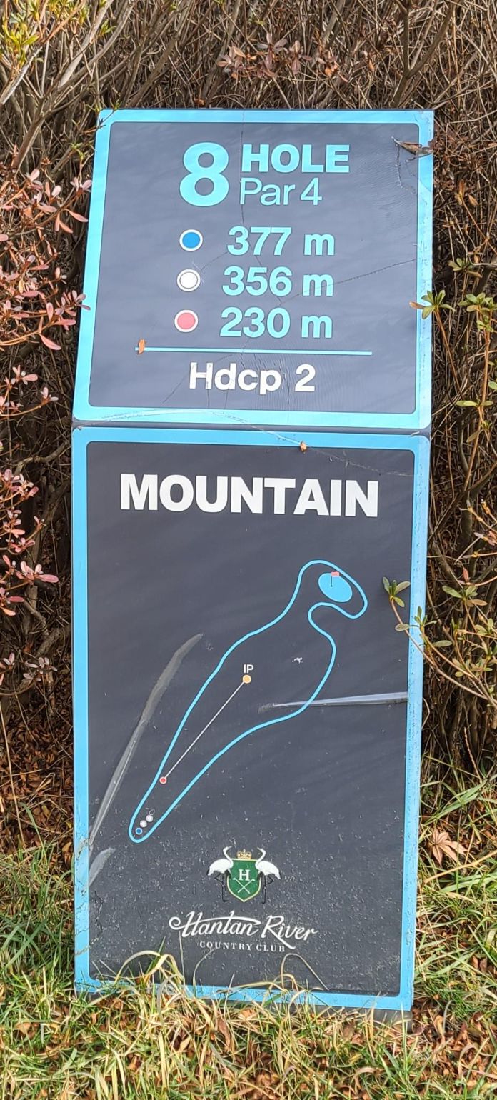 마운틴 8번 코스는 360m 파4홀 티잉그라운드에서 그린끝까지 내리막으로 이루어져 있으며 독특한점은 사진에서 처럼 크린이 아일랜드홀과 같이 이루어져 있어 세컨샷에서 매우 정확한 샷이 이루어져야 그린온을 시킬 수가 있는 구조입니다. 내리막 언둘레이션과 아일랜드형 그린 그리고 긴 거리까지 어려움의 삼박자가 물려있는 홀이므로 신중하게 공략하지 않으면 타수를 잃어버리기 좋은 코스라고 할 수 있습니다.