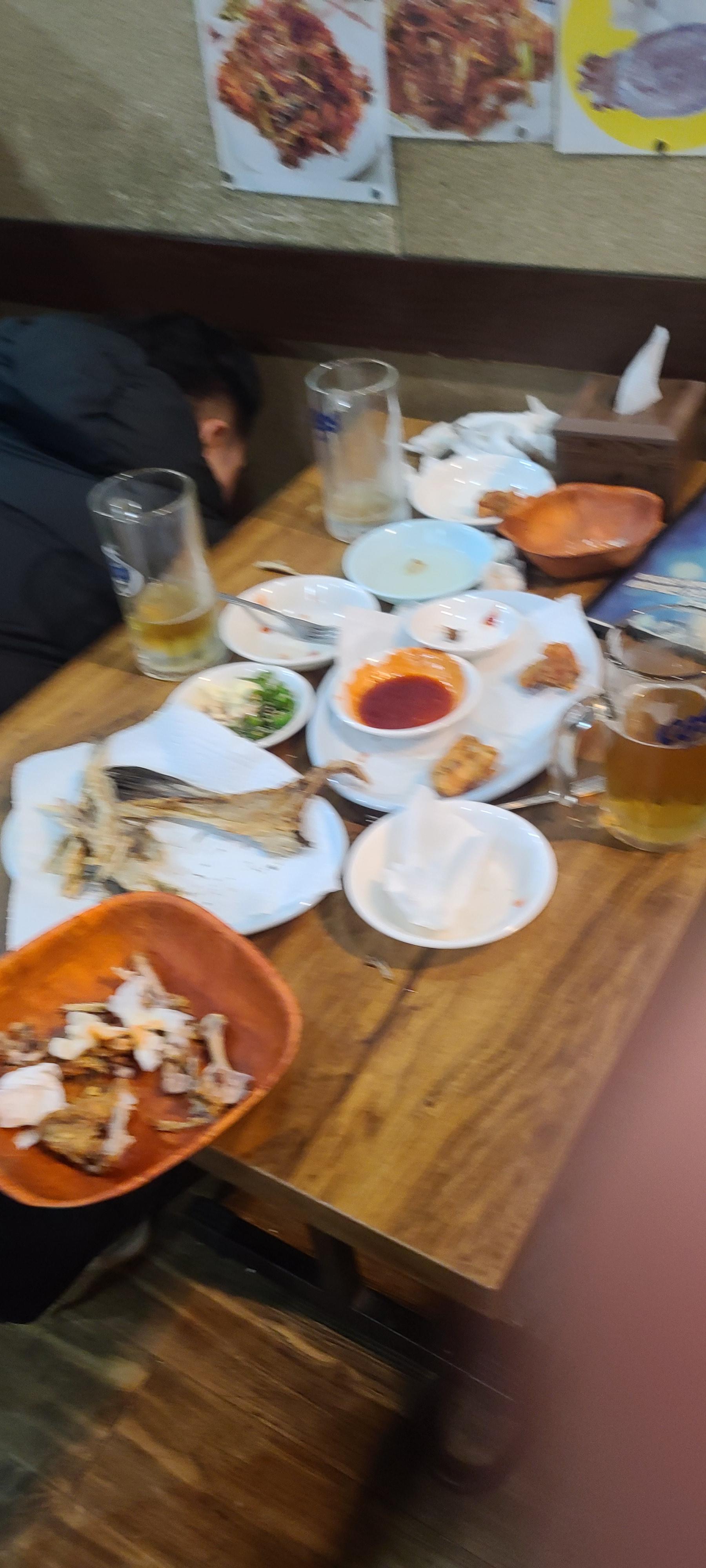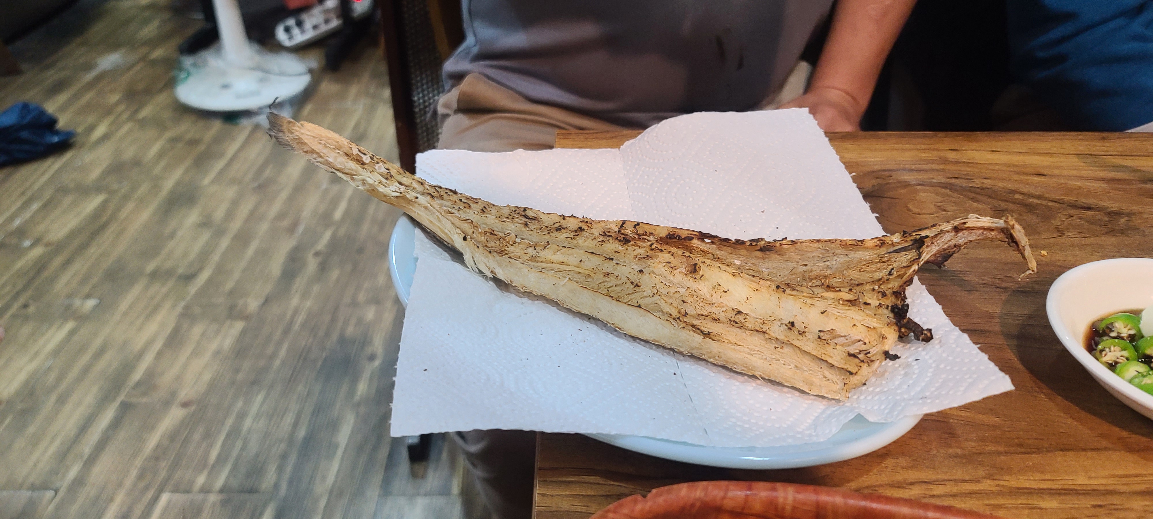 맛있게 치킨을 뜯고 술을 더먹기 위하여 안주로 뭐가 좋을까 보다가 배가부르지 않고 맥주를 마시기 좋은 마른안주에서 먹태를 주문합니다. 먹태를 통으로 구워서 북북 직접 찢어주시는 모습이 어머니생각도 나고 무언가 토속적인 느낌이라 더욱 기분이 서정적으로 바뀌게 되는 것을 느끼게 됩니다. 먹태를 씹으며 즐거운 시간을 보내니 5테이블 정도되는 내부는 이미 손님이 꽉찬상태 역시 2차집이라 시간이 늦을 수록 사람들이 귀가전에 많이 들리는 곳이라는 것을 느끼게 됩니다.