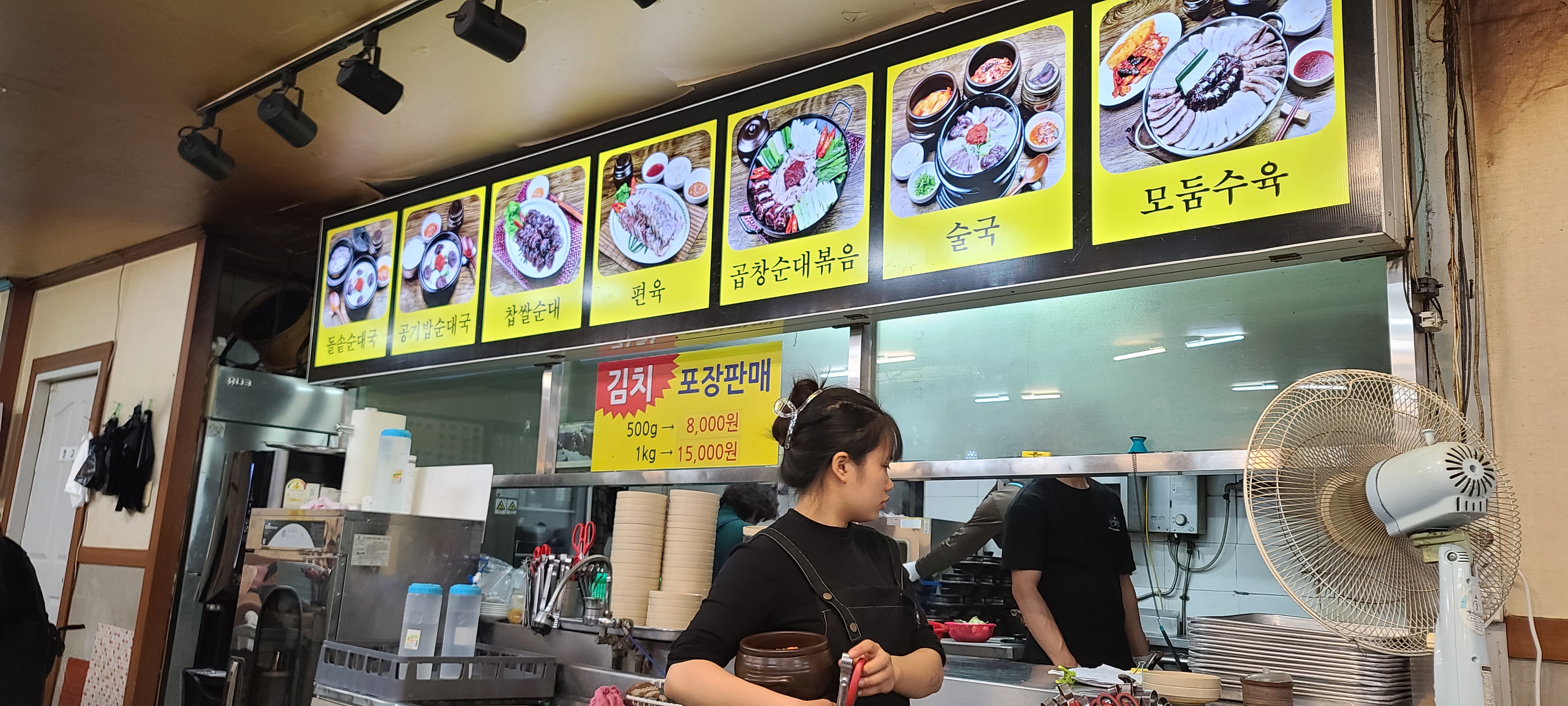 가게 안으로 들어가니 넓은 홀에 식탁이 셀수 없이 펼쳐져 있고 직원들이 바삐 움직이는 모습을 볼 수가 있습니다. 자리를 잡고 주방쪽을 살펴보니 오픈형 주방에 쉴새없이 조리를 하고 계시고 직원분들도 서빙을 하느라 바쁜모습이 전형적인 잘나가는 맛집의 모습을 보여주고 있어 벌써부터 기대가 되고 있습니다. 메뉴를 살펴보니 특이하게도 돌솥순대국과 일반순대국이 있습니다. 무엇을 먹을까 생각하다 일반순대국은 어디서나 먹을 수 있지만 이 가게만의 특별해보이는 메뉴 돌솥순대국을 주문하고 기다려봅니다.