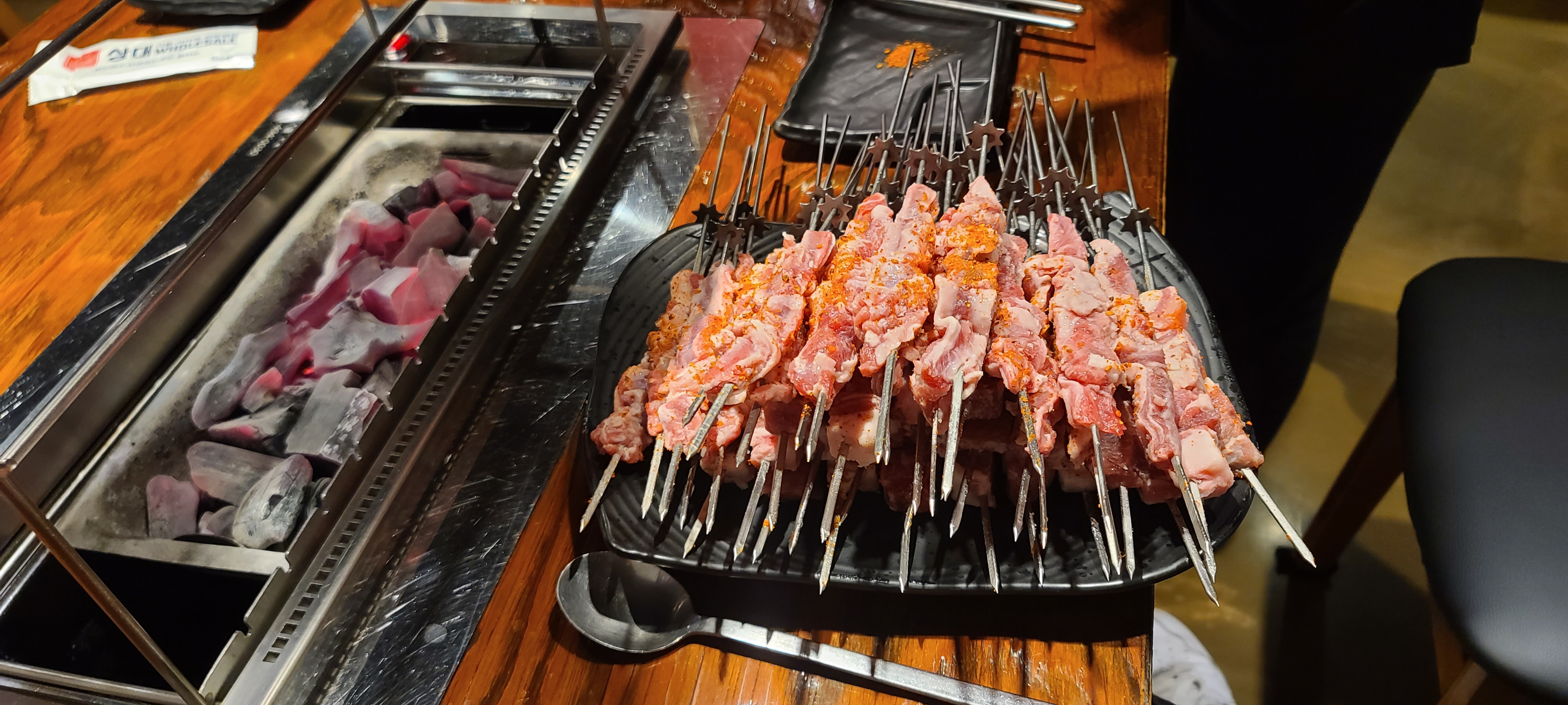주문을 하고 잠시 기다리자 강력한 화력의 참숯과 양꼬치 그리고 양갈비를 세팅해 주신 모습입니다. 세팅된 참숯불 그리고 수북히 쌓인 양고기 언제나 양꼬치를 먹을때 가장 설레는 순간이 아닐 수 없습니다.