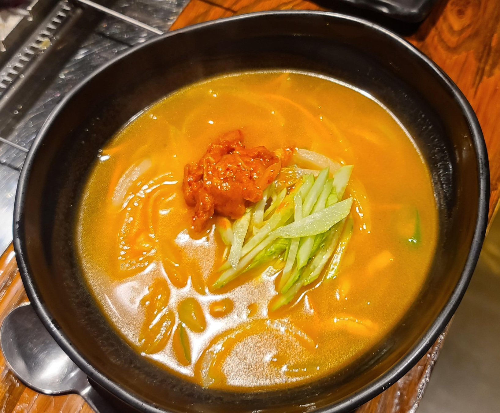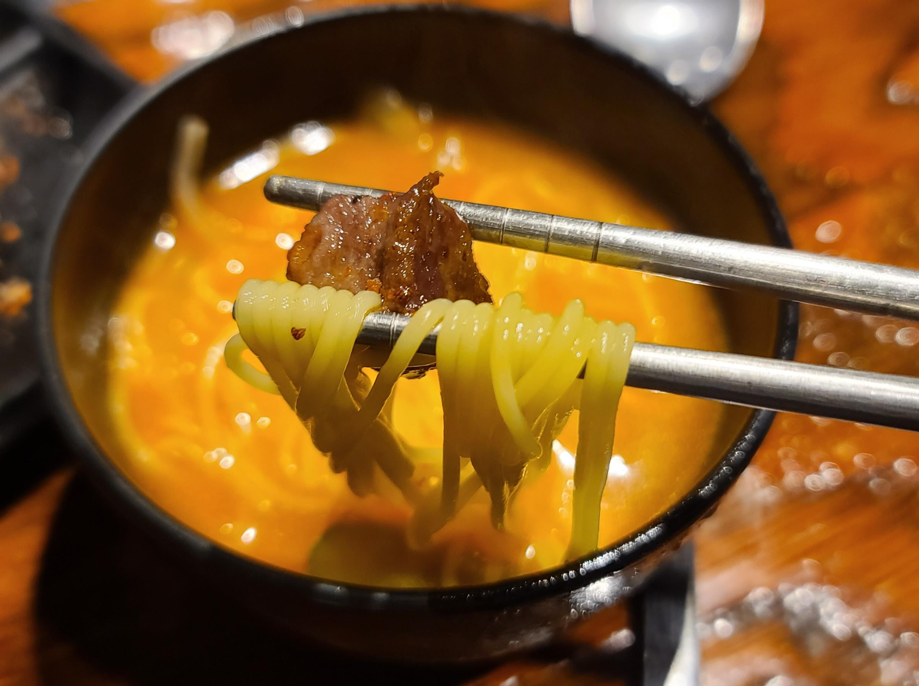 양꼬치를 맛있게 먹는 방법은 여러가지가 있지만 옥수수온면에 양꼬치를 싸서 먹으니 탄수화물과 고기가 섞여지며 매우 만족스러운 맛을 느끼게 해주는 훌륭한 조합이 탄생하며 양꼬치를 이런저런 방법으로 계속해서 즐기게 됩니다. 옥수수 온면의 칼칼한 맛과 감칠맛 그리고 면의 식감이 양고기와 어우러지며 천상의 맛을 자아내고 있습니다.