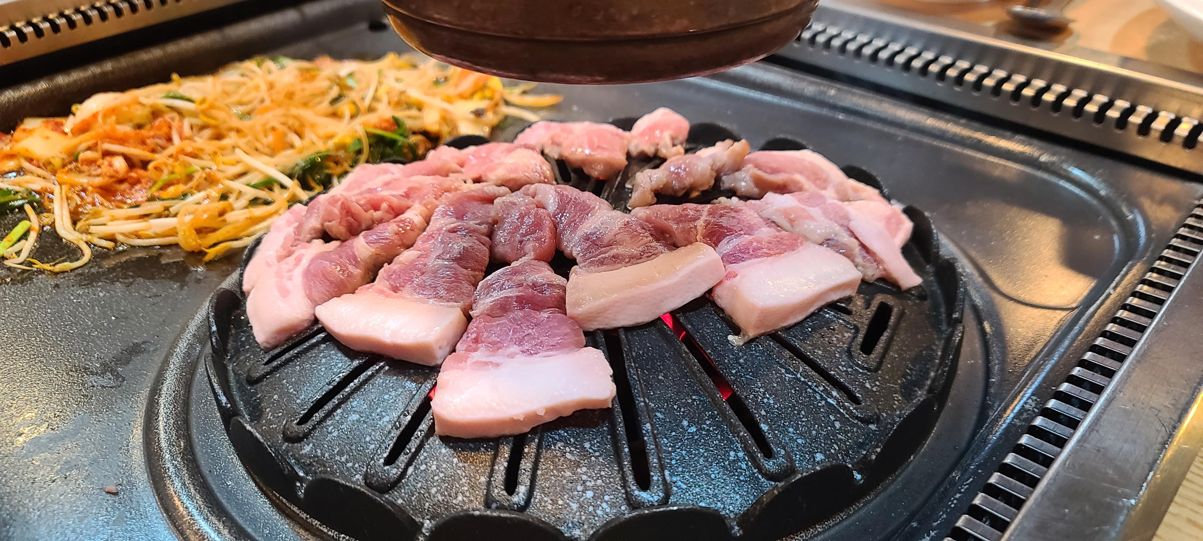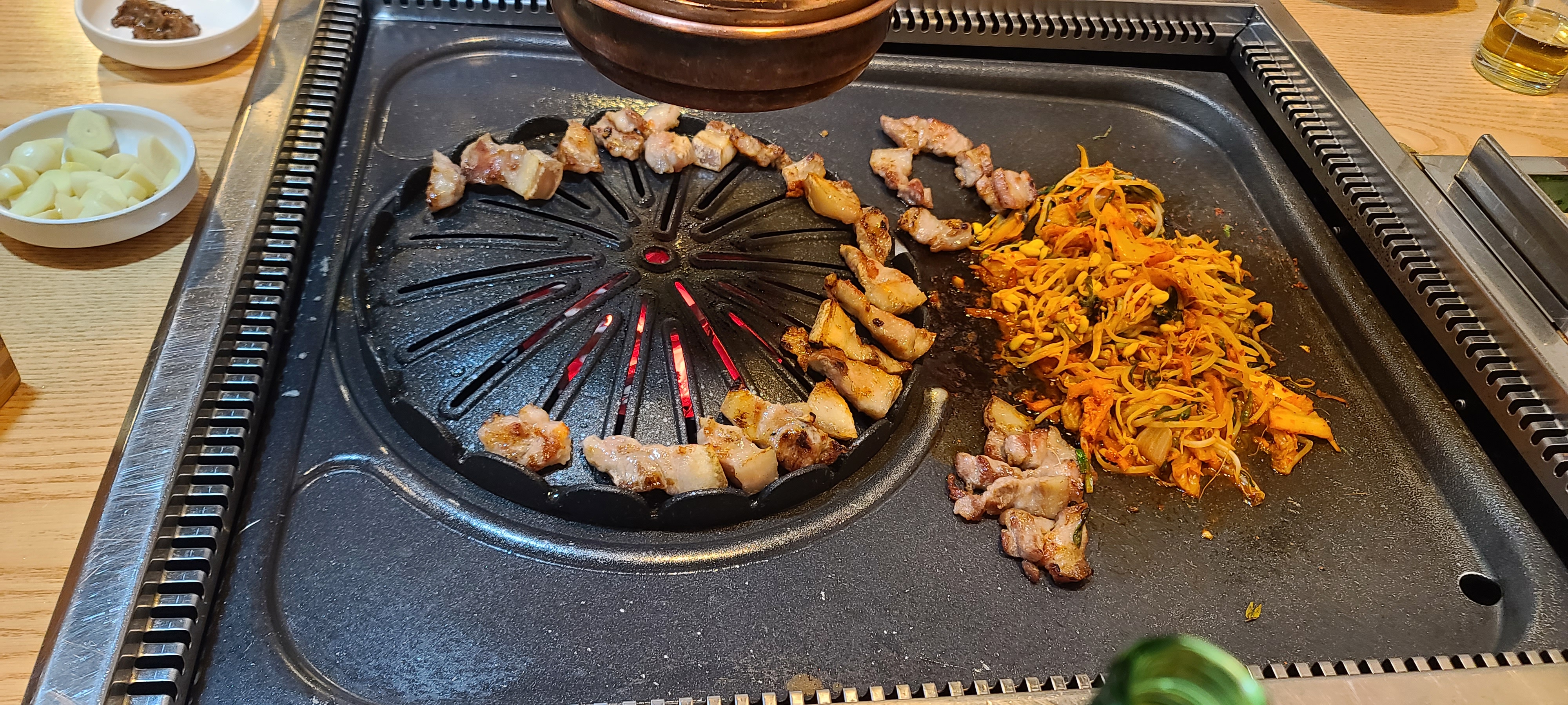 고기를 주문하고 불판을 살펴보니 한쪽으로 숯불화로가 세팅되고 고기가 잘 익으면 아랫쪽의 넓직한 철판에 옮겨서 고기가 식지않게 데우면서 먹고 또한, 철판에 야채와 김치도 구워먹을 수 있기 때문에 정말 편리하고 참으로 회식용 고기불판이라는 생각을 하게 됩니다.