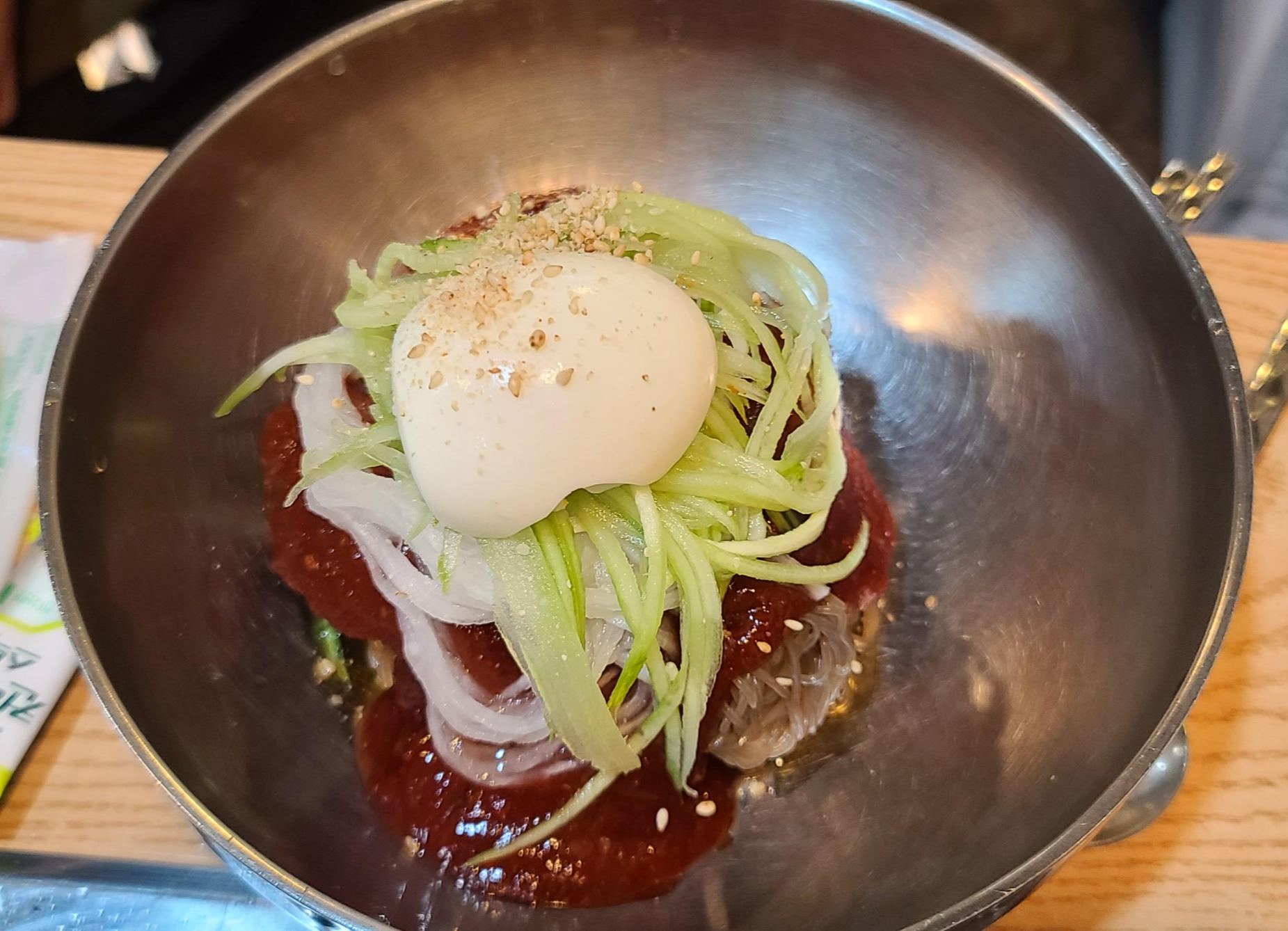 계속되는 메뉴비교의 차례 영원한 난제라고 할 수 있는 비냉과 물냉을 비교해가며 맛을 보기로 합니다. 물냉을 한젓가락하고 육수를 맛보니 무언가 된장국의 심심한 느낌이 그대로 전해져 오지만 비빔냉면을 잘 비벼서 맛을보니 조미료의 감칠맛과 양념맛이 잘 배어 맛이 살아나는게 김치찌개의 강렬한 느낌과 똑같습니다. 어떻게 메뉴마다 이리 극과 극을 달릴수가 있는지 설마 주방장이 2분계셔서 각각 다른 맛을 주무기로 내는것은 아닐지 의심이 들기까지 하는 순간입니다.