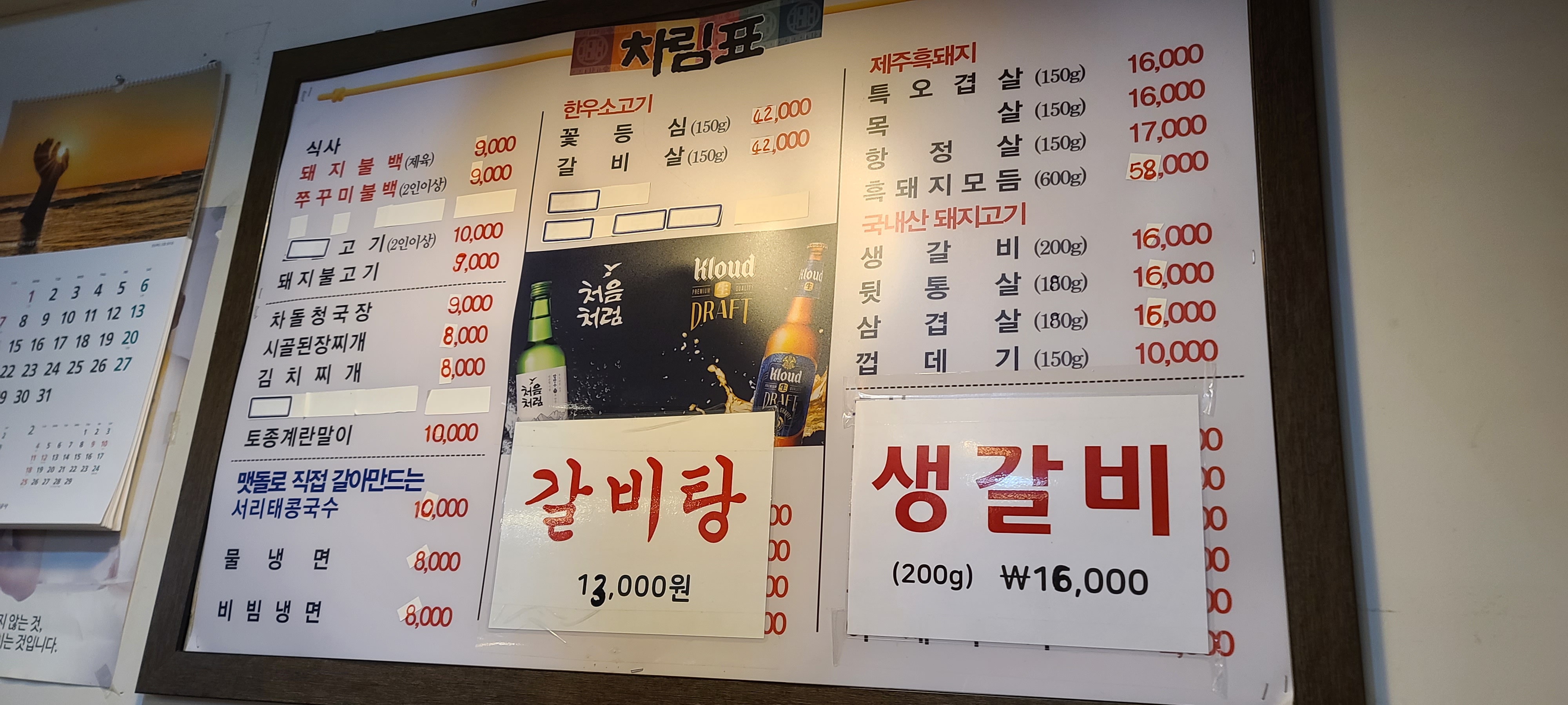 가게 안으로 들어가서 살펴보니 중앙이 통로로 주방과 일직선인 구조에 양옆으로 테이블이 깔려있어 테이블 이동도 쉽고 붙여서 여러명이 앉을 수 있는 좌석이라 단체석에 정말로 좋다는 것을 알게됩니다. 자리를 잡고 메뉴판을 살펴보니 제주흑돼지, 한우소고기 두가지 대표메뉴에 가게 이름과 같은 돼지불백, 쭈구미불백과 같은 식사도 있고 전형적인 낮에는 식사 밤에는 고깃집의 모습을 보여주고 있습니다. 무엇을 먹을까 하다가 회식이니 메뉴를 하나씩 시켜보기로 하고 이것 저것 주문해봅니다.