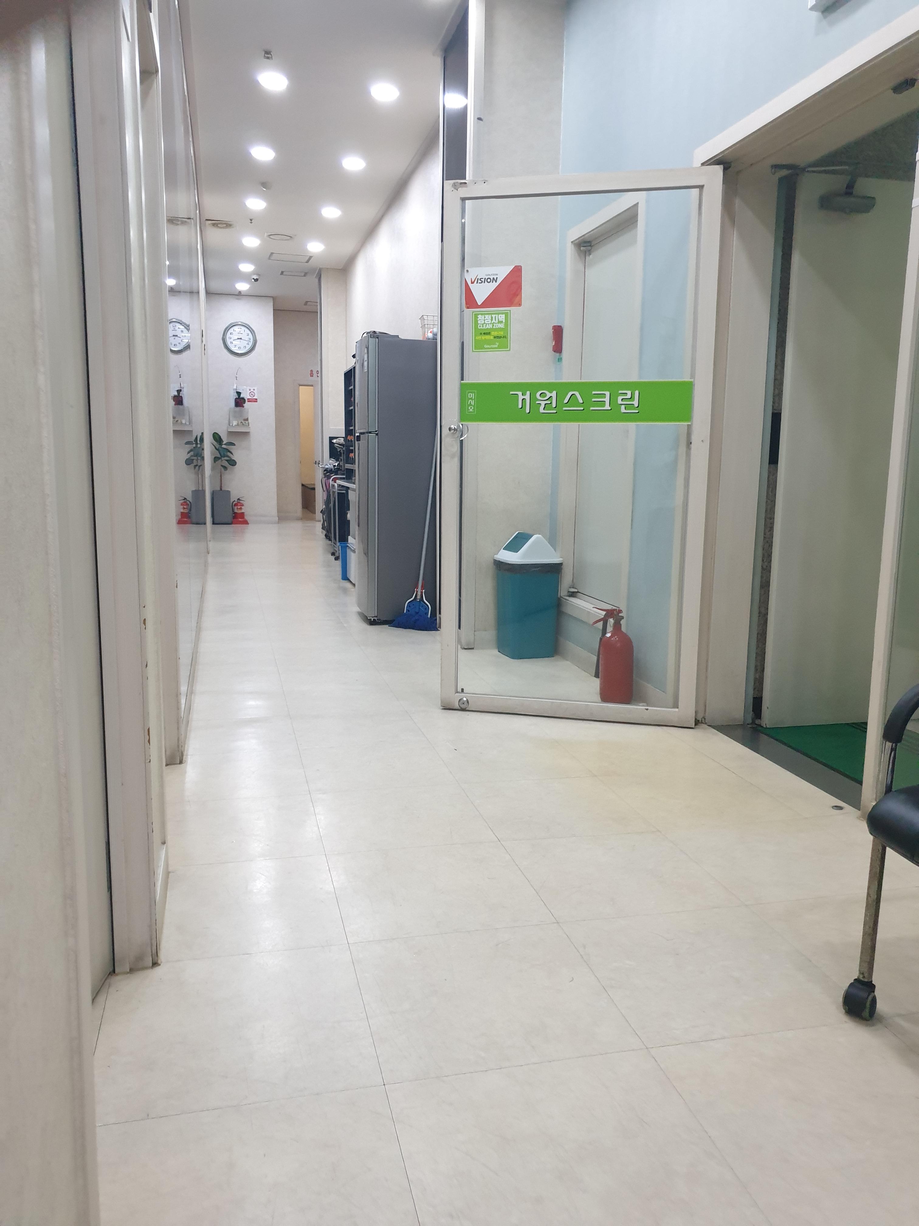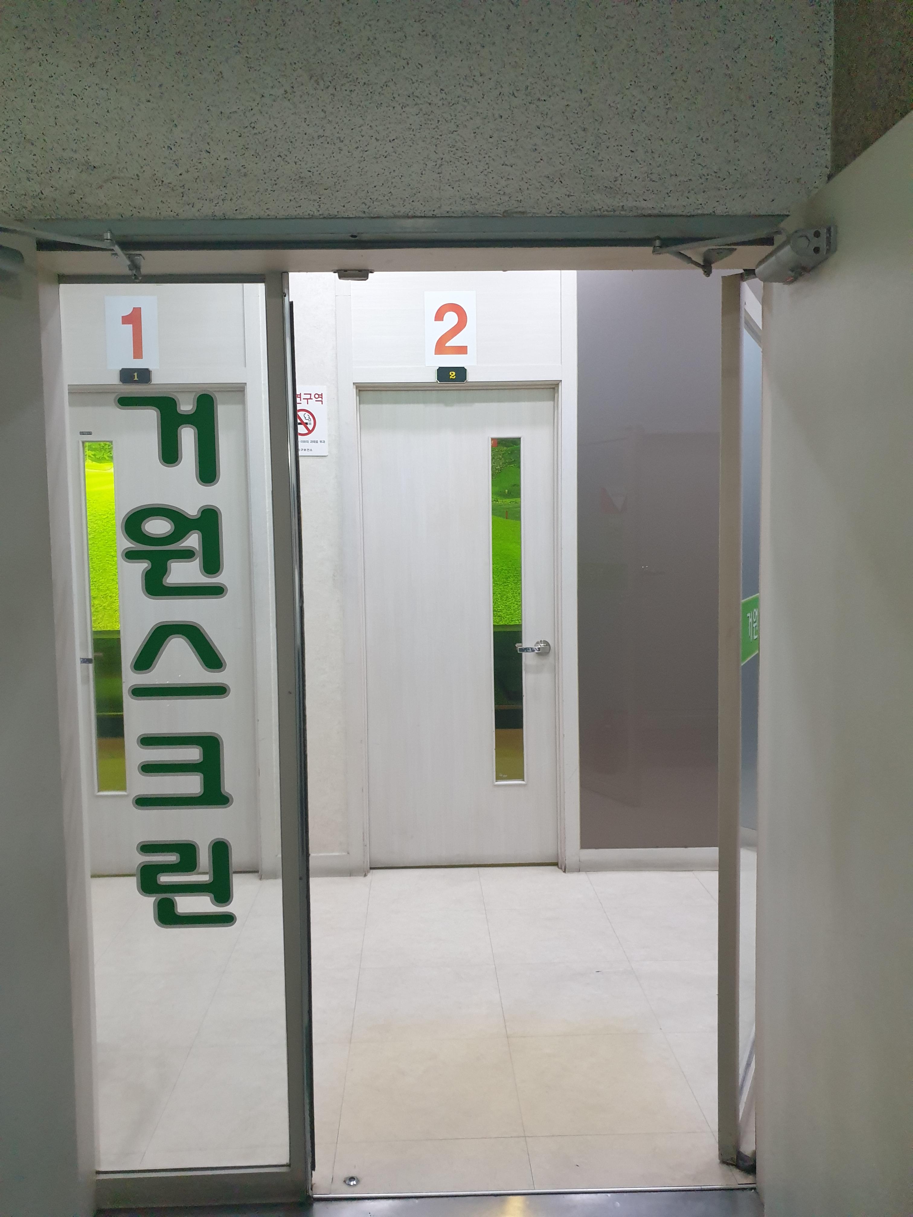 건물지하로 내려가면 거원스크린 입구가 나타나며 입구를 들어서면 일자형으로 된 복도로 방들이 늘어서 있습니다. 세보니 5개의 방을 보유하고 있는 아담한 사이즈의 스크린골프장입니다.