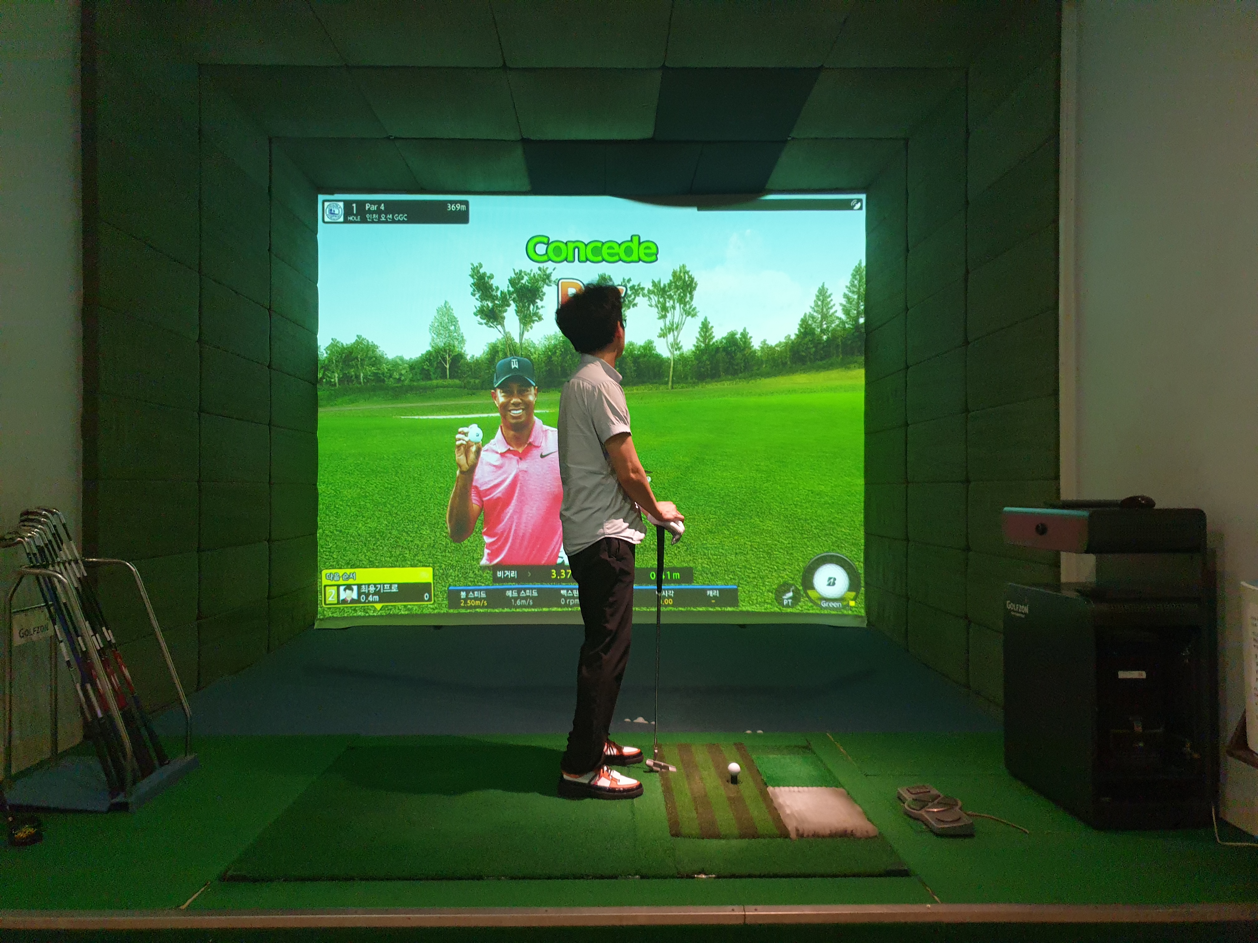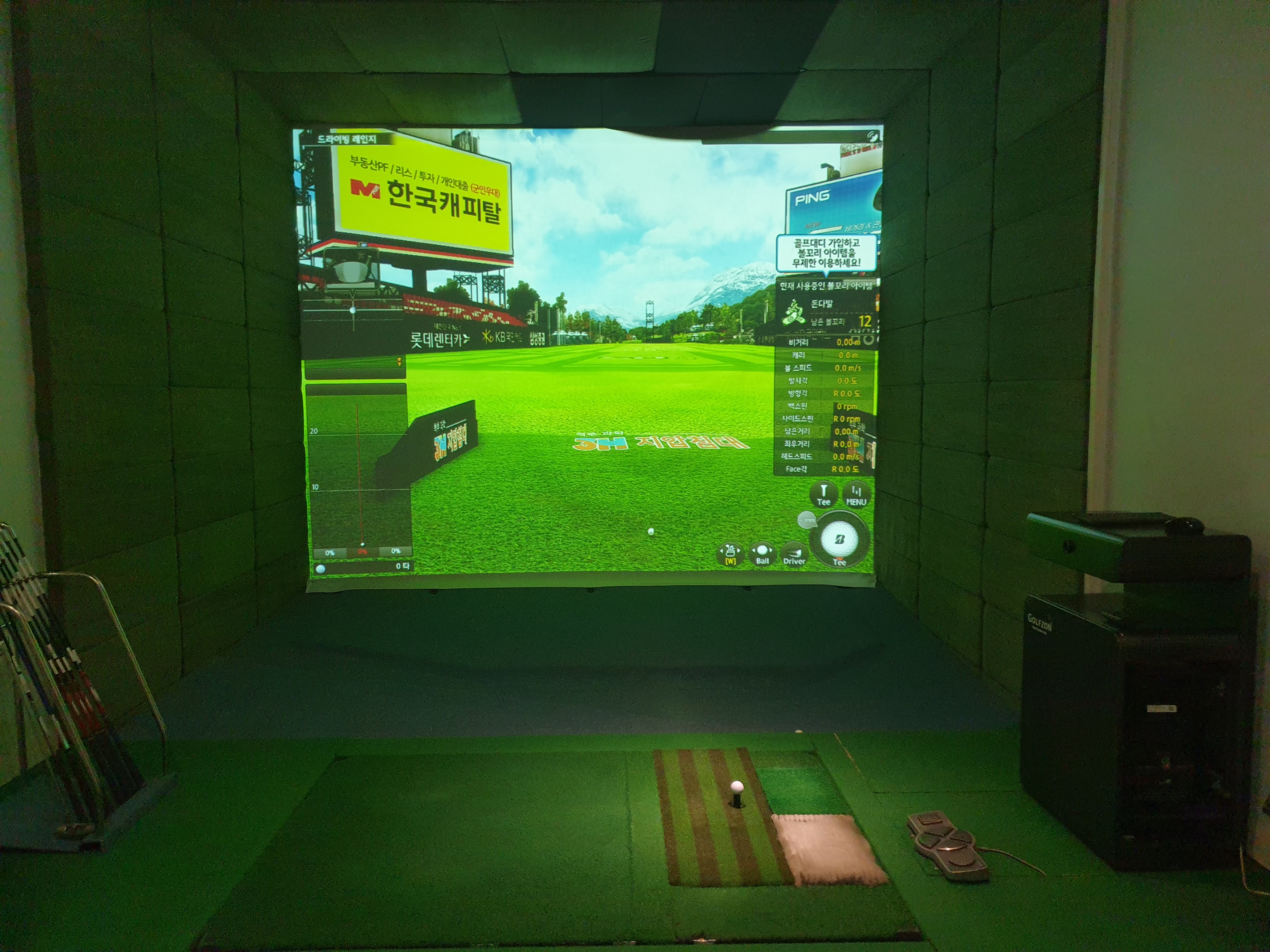 실내에 들어가서 타석과 시스템을 보니 골프존의 비전플러스를 적용한 스크린 골프장입니다. 연습용 아이언과 드라이버 우드등은 방안에 배치되어 있으며 드라이버를 9.5로 바꿔달라고 요청하니 가져다 주십니다.