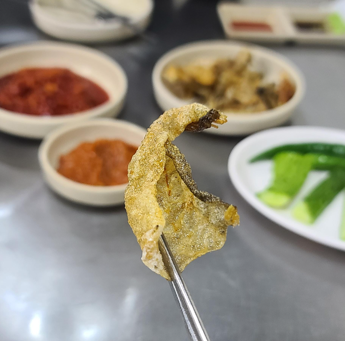 굴찜과 해산물이 나오길 기다리면서 기본찬을 맛보려고 살펴보니 배추와 오이, 당근, 고추 조합의 생야채와 쌈장, 김치소까지는 익숙한데 쥐포튀김과 같은 상당히 독특한 밑반찬을 보게됩니다. 맛을보니 쥐포는 아니고 생선포를 튀긴것 같은데 상당히 독특한 맛과 식감을 보여주고 있습니다.