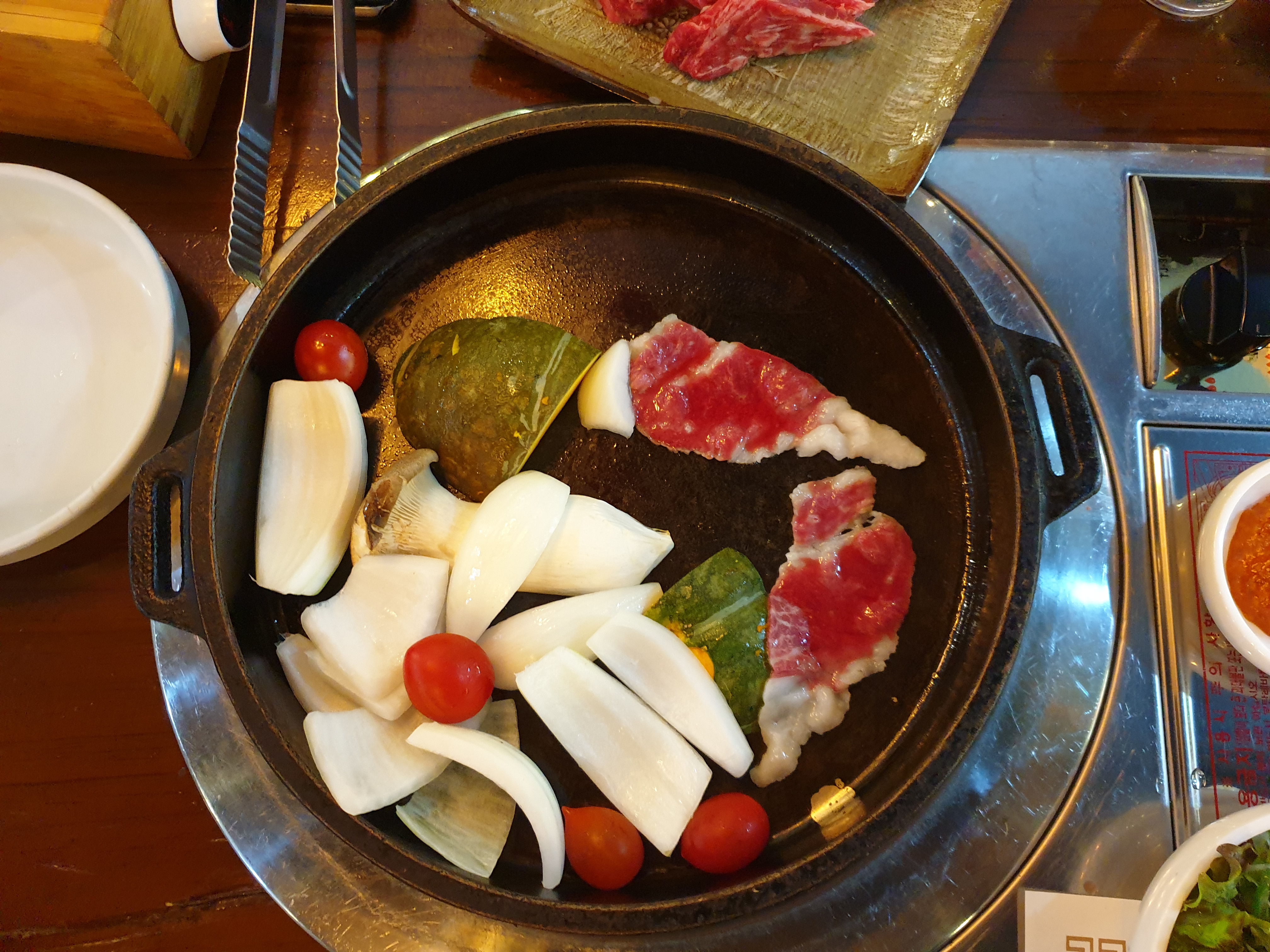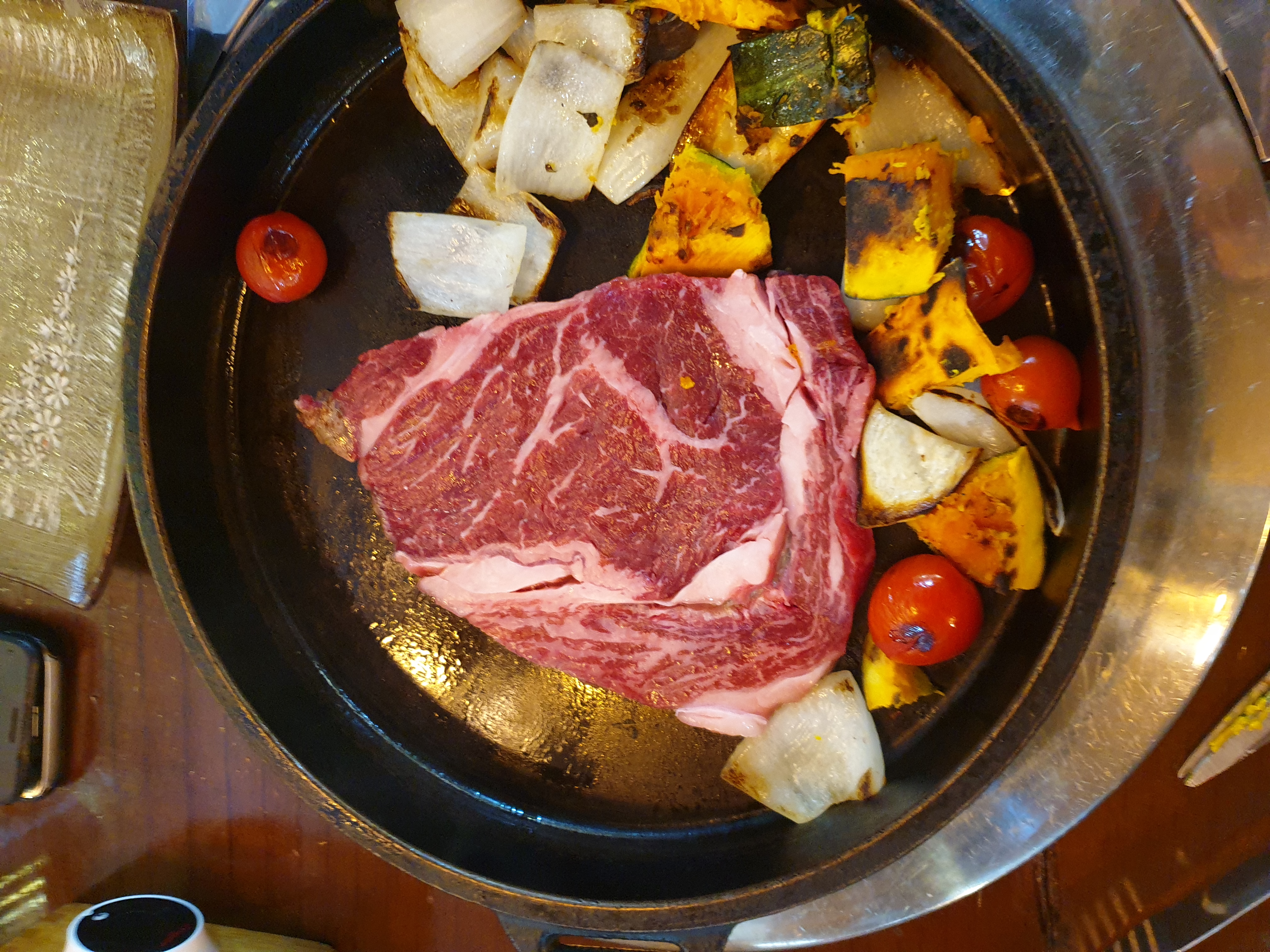 드디어 하이라이트 메인인 한우 등심을 철판에 구워봅니다. 때깔이 영롱합니다. 한우등심이 맛있게 구워질동안 정성스레 구워놓은 야채로 입맛을 새롭게 합니다.