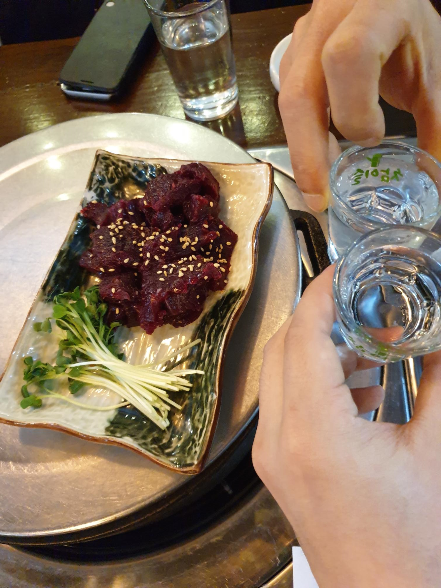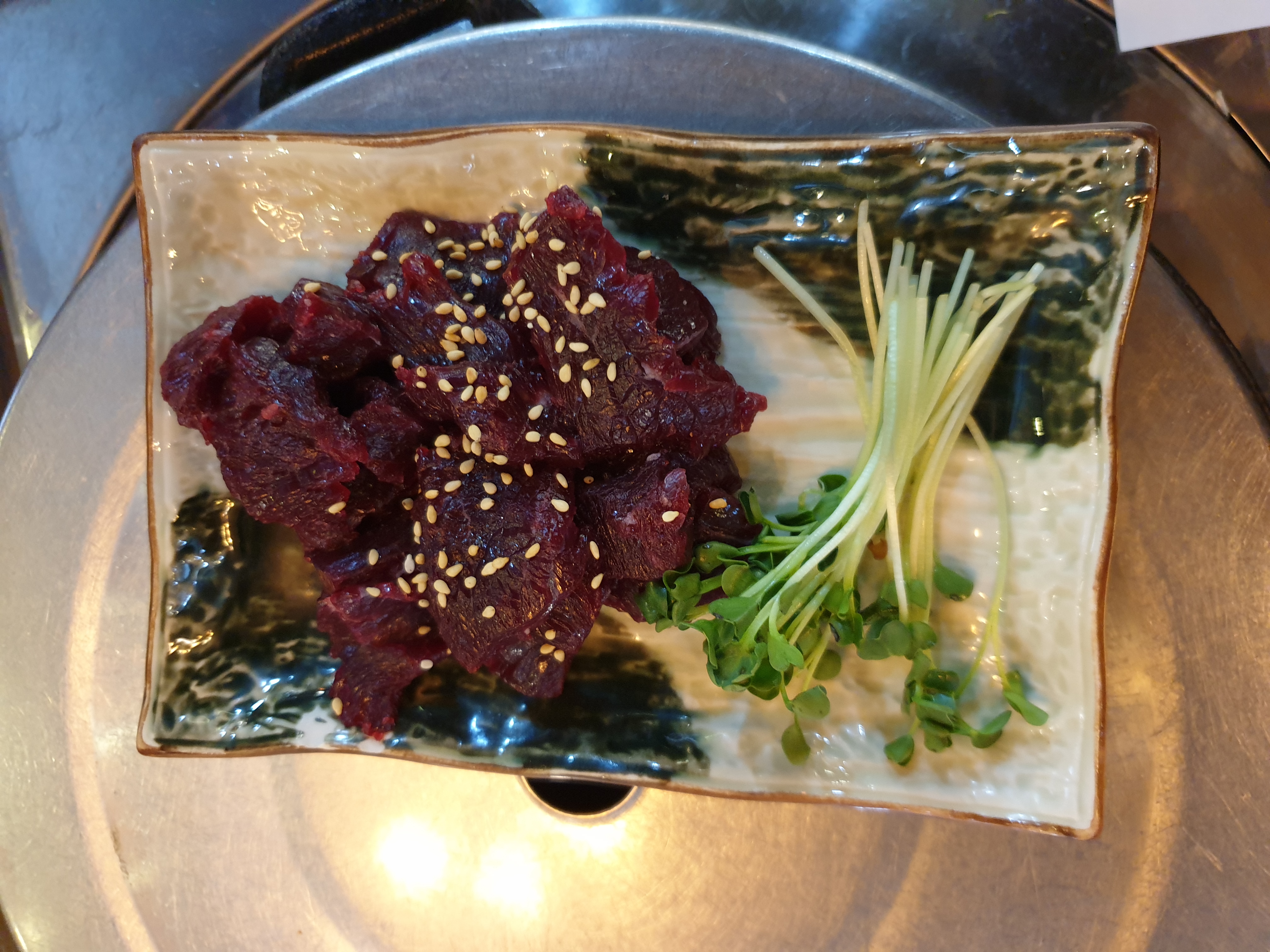 주문을 하고 기다리니 뭉티기 2인분이 나왔습니다. 한점먹어보니 육회와는 다른 육사시미의 고소함이 입안가득히 퍼집니다. 특히 특제 양념장에 찍어먹으니 진짜로 새로운 맛입니다. 파트너사도 좋아합니다. 성공적인 비즈니스의 스타트입니다.
