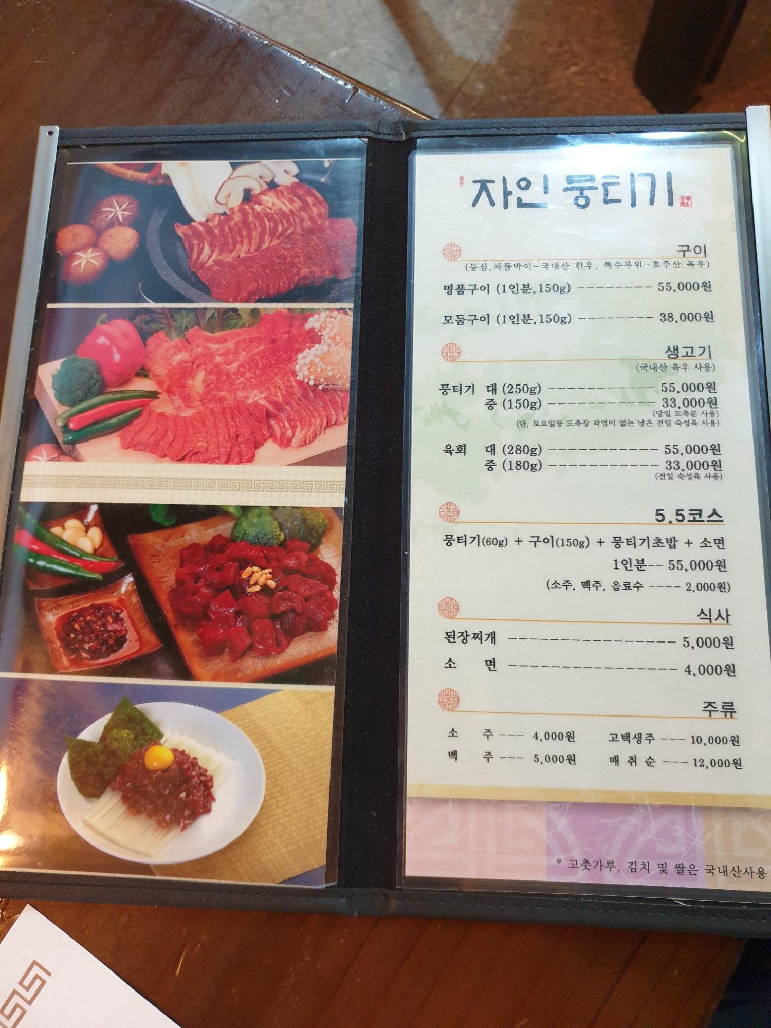 메뉴판을 달라하고 한번 쭈욱 둘러봅니다. 뭉티기가 한우라서 그런지 가격이 비싸게 느껴집니다. 250그램에 5만5천원 다른 구이소고기도 1인분에 5만5천원 결코 싸지않은 가격입니다. 하지만 뭉티기집에 뭉티기를 먹으러 온것이니 일단 모든것을 맛볼 수 있는 코스로 시켜봅니다.