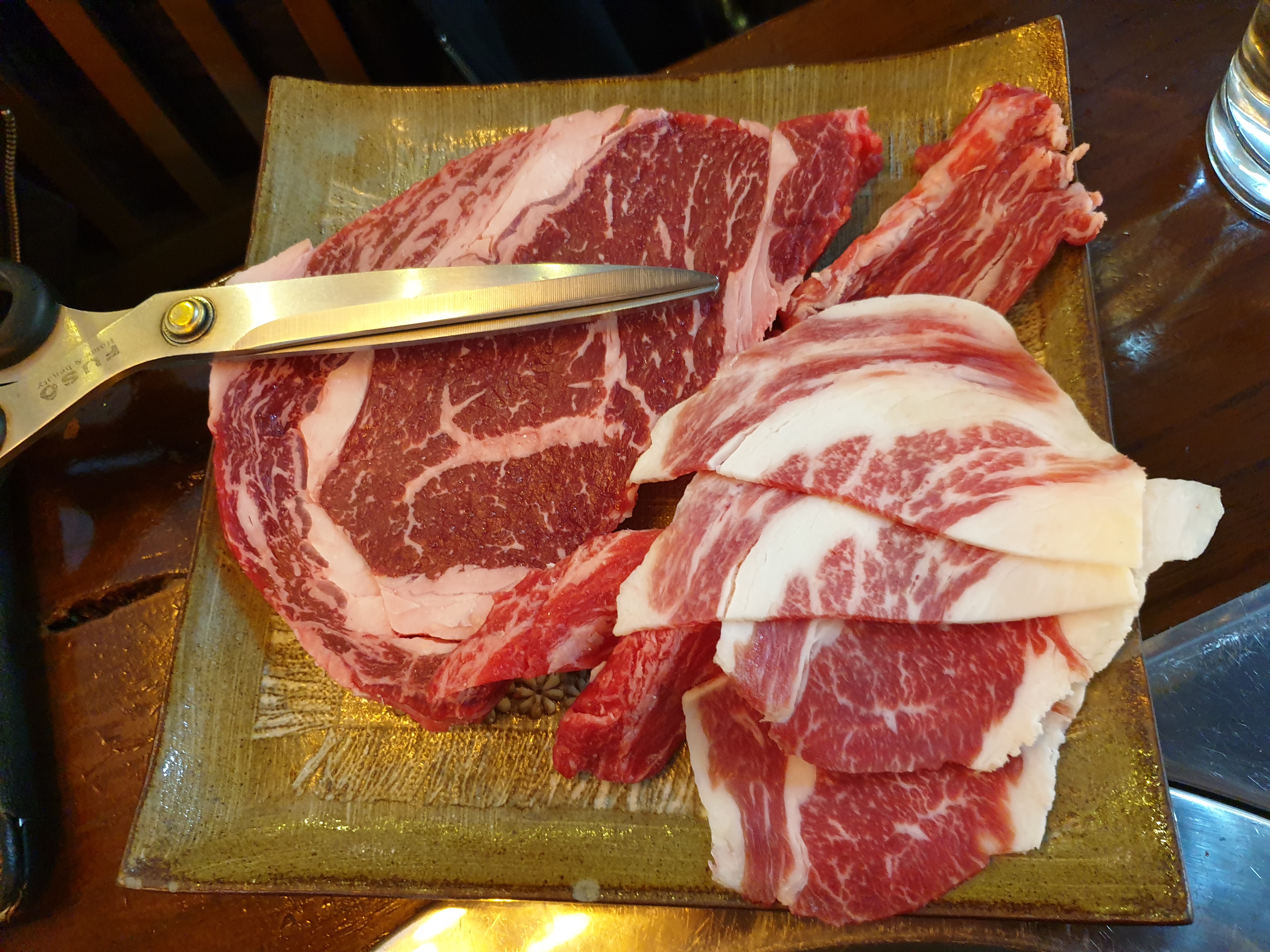 육사시미와 초밥에 이어 본격적으로 한우 구이가 나옵니다. 등심,갈비,차돌박이인것 같습니다. 일단 보이는 육질의색과 마블링은 좋아보입니다.