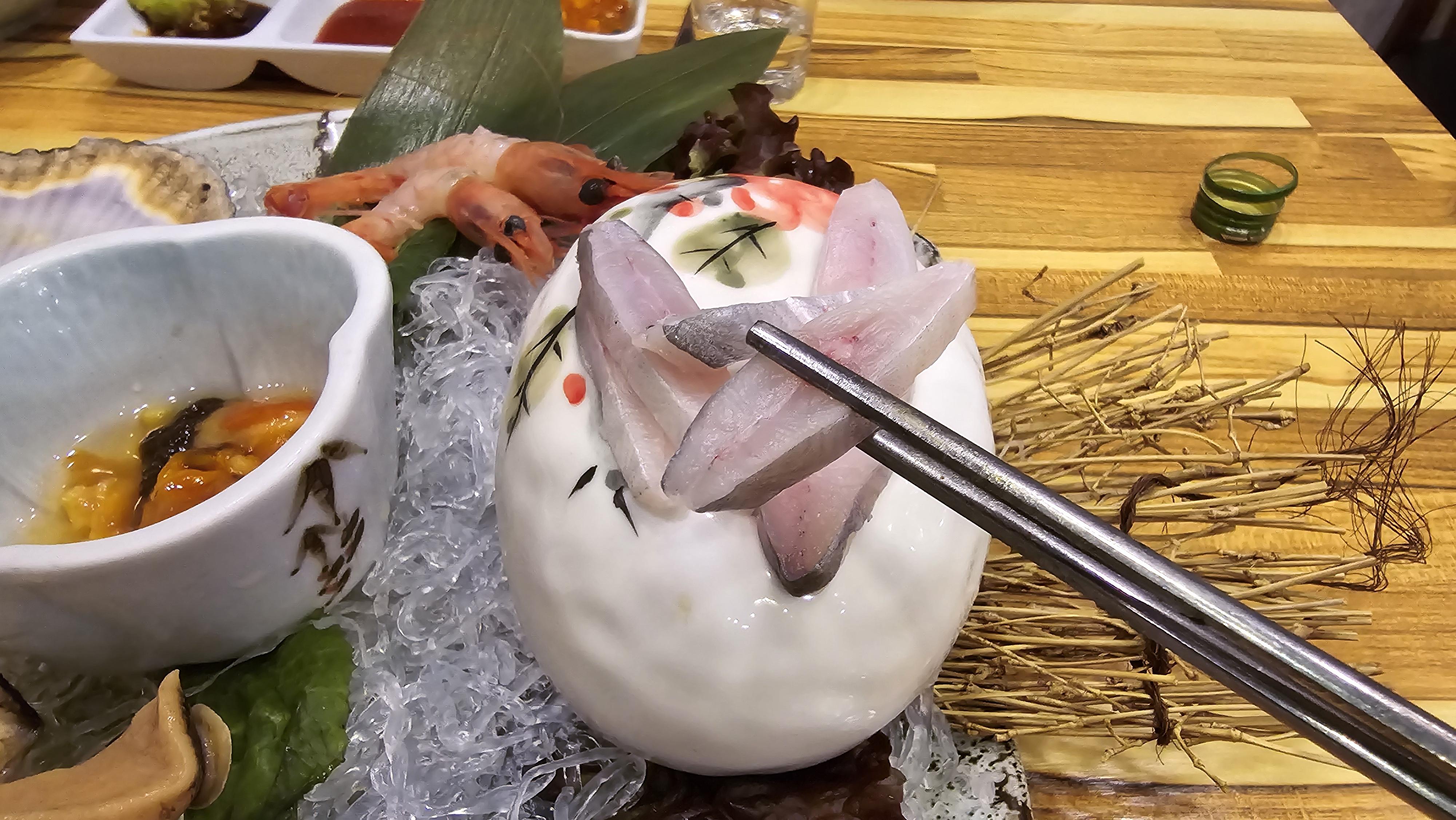 첫번째 메뉴인 세꼬시 무침을 그냥 패스해버리고 두번째 해물모듬 스끼다시가 나왔습니다. 가리비, 멍게, 단새우, 소라, 병어의 조합이며 병어회의 비주얼이 가장먼저 눈에 들어옵니다.