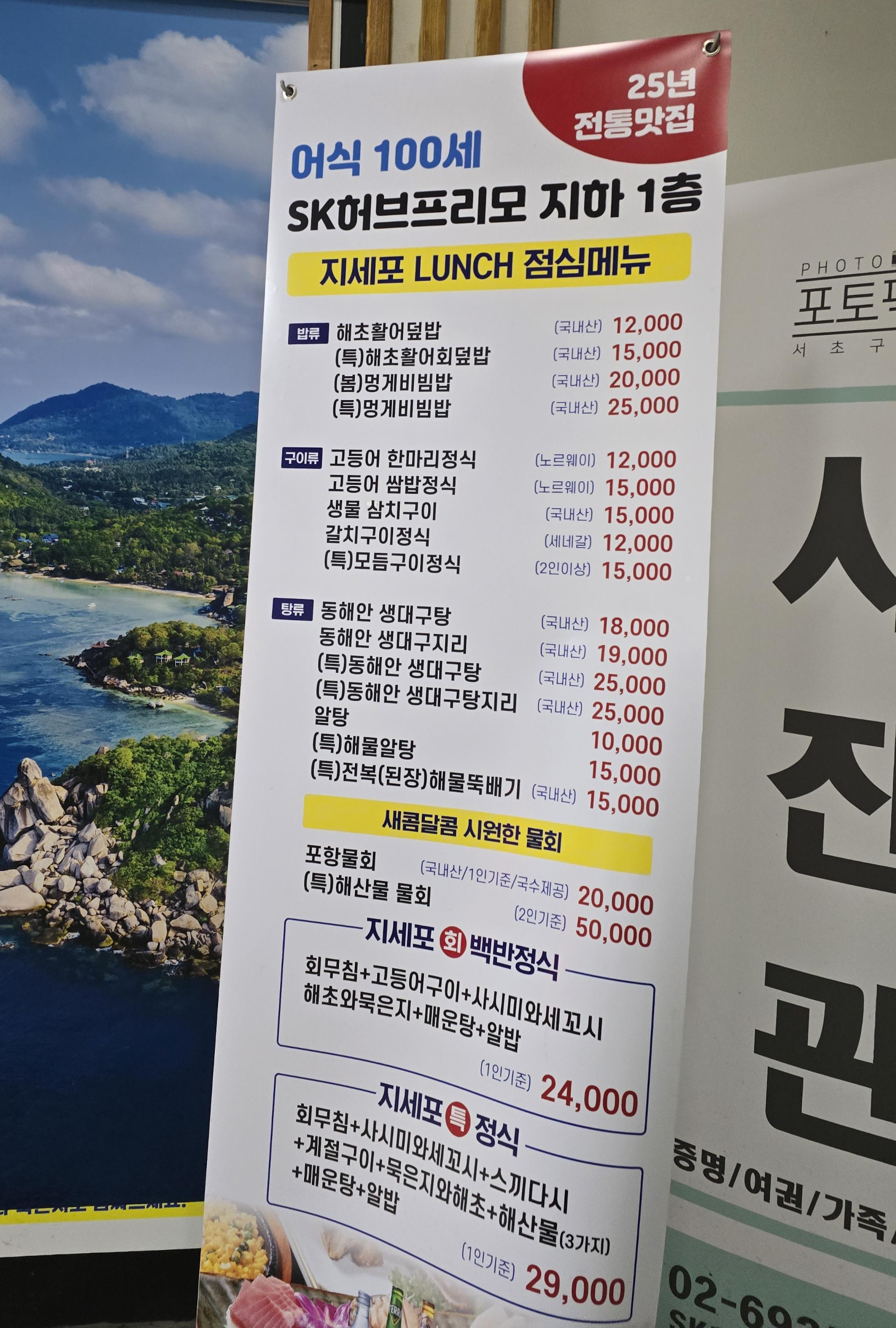 양재역과 이어진 SK 허브프리모 지하엔 맛집이 많이 있어 방문할때마다 한번 가봐야겠다는 생각을하다가 근처 비즈니스 미팅을 마치고 맛있는 저녁을 먹으러 지세포세꼬시를 방문해보게 됩니다. 건물 지하로 나래가서 입구를 보니 간판에 메뉴가 적혀있고 25년 전통 맛집이라는 문구가 한 지역에서 오래된 식당이라는 것을 말해주고 무언가 맛있을거 같다는 예감을 전해주고 있습니다.